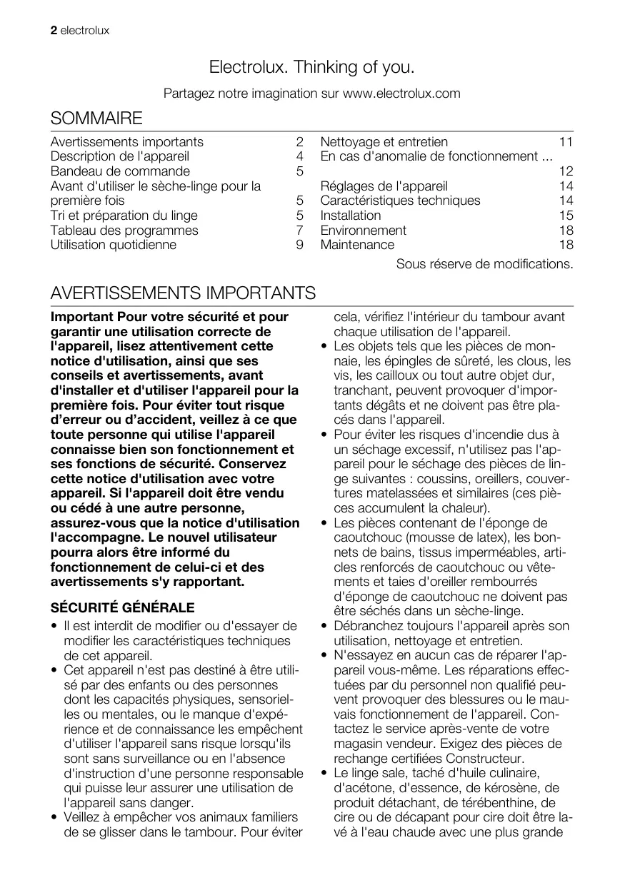 NOTICE D'UTILISATION 2 electrolux Electrolux. Thinking of you. Partagez notre imagination sur www.electrolux.com SOMMAIRE Avertissements importants Description de l'appareil Bandeau de commande Avant d'utiliser le sèche-linge pour la première fois Tri et préparation du linge Tableau des programmes Utilisation quotidienne