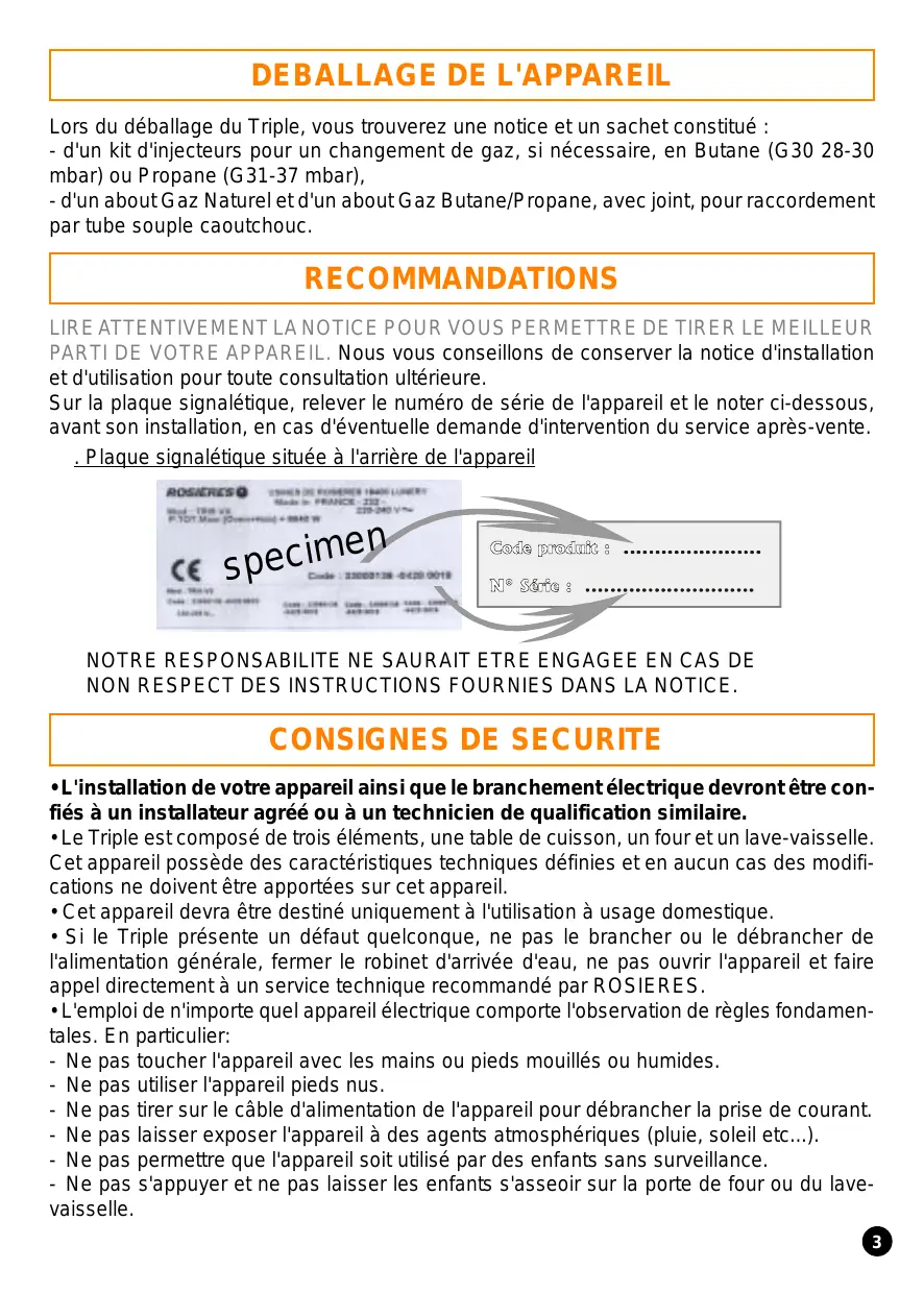 INSTALLATION La mise en place fonctionnelle des appareils ménagers dans leur environnement est une opération délicate qui, si elle n'est pas correctement effectuée, peut avoir de graves conséquences sur la sécurité des consommateurs. Dans ces conditions, il est impératif de confier cette tâche à un professionnel qui la réalisera conformément aux normes techniques en vigueur. Si malgré cette recommandation, le consommateur réalisait lui-même l'installation, les Sociétés Groupe Rosières et Usines de Rosières déclineraient toute responsabilité en cas de défaillance technique du produit entraînant ou non des dommages aux biens et/ou aux personnes. --------------------------------------------------------------------------------------------------------------------------INSTALLATION --------------------------------------------------------------------------------------------------------------------------• Avant installation, le technicien doit : . Vérifier la compatibilité entre l'appareil et l'installation gaz. Le Triple est réglé en usine pour le fonctionnement au gaz dont la nature est indiquée sur l'emballage et rappelée sur l'étiquette apposée sur l'appareil. Gaz Naturel G 20-20 mbar / G 25-25 mbar : gaz distribué par le réseau. . Effectuer, si nécessaire, le changement de gaz en adaptant les brûleurs gaz de table avec la mise en place des injecteurs appropriés qui assurent le débit nominal (page 6).