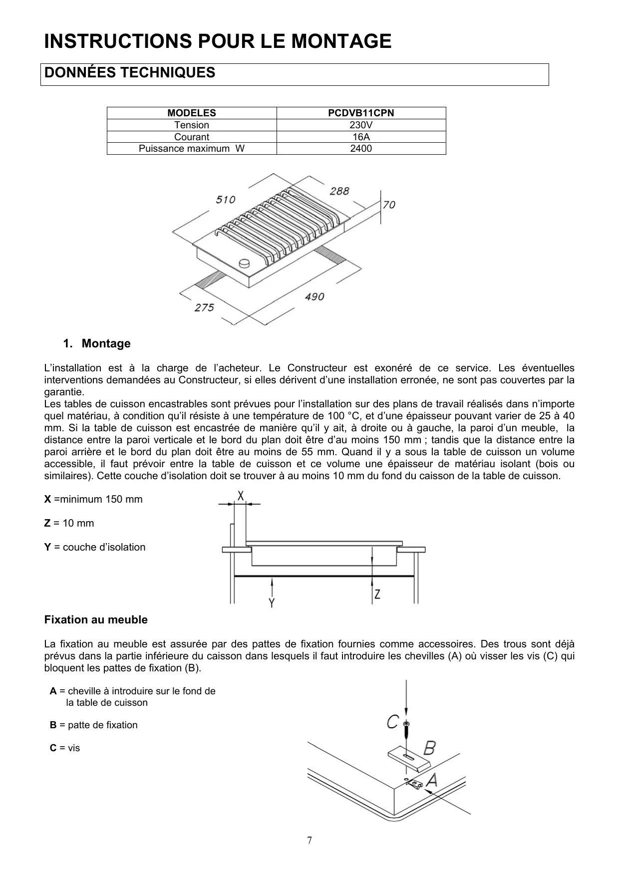 Les tables de cuisson encastrables sont prévues pour l'installation sur des plans de travail réalisés dans n'importequel matériel, a condition qu'il résiste à une température de 100^, et d'une epaisseur pouvant varier de 25 à 40 mm. Si la table de cuisson est encastrée de manière qu'il y ait, a droite ou a gauche, la paroi d'un meuble, la distance entre la paroi verticale et le bord du plan doit etre d'au moins 150~mm; tandis que la distance entre la paroi arriere et le bord du plan doit etre au moins de 55~mm .Quand il y a sous la table de cuisson un volume accessible, il faut prevoir entre la table de cuisson et ce volume une epaisseur de materiaiu isolant (bois ou similaires). Cette couche d'isoation doit se trouver a au moins 10mm du fond du caisson de la table de cuisson.