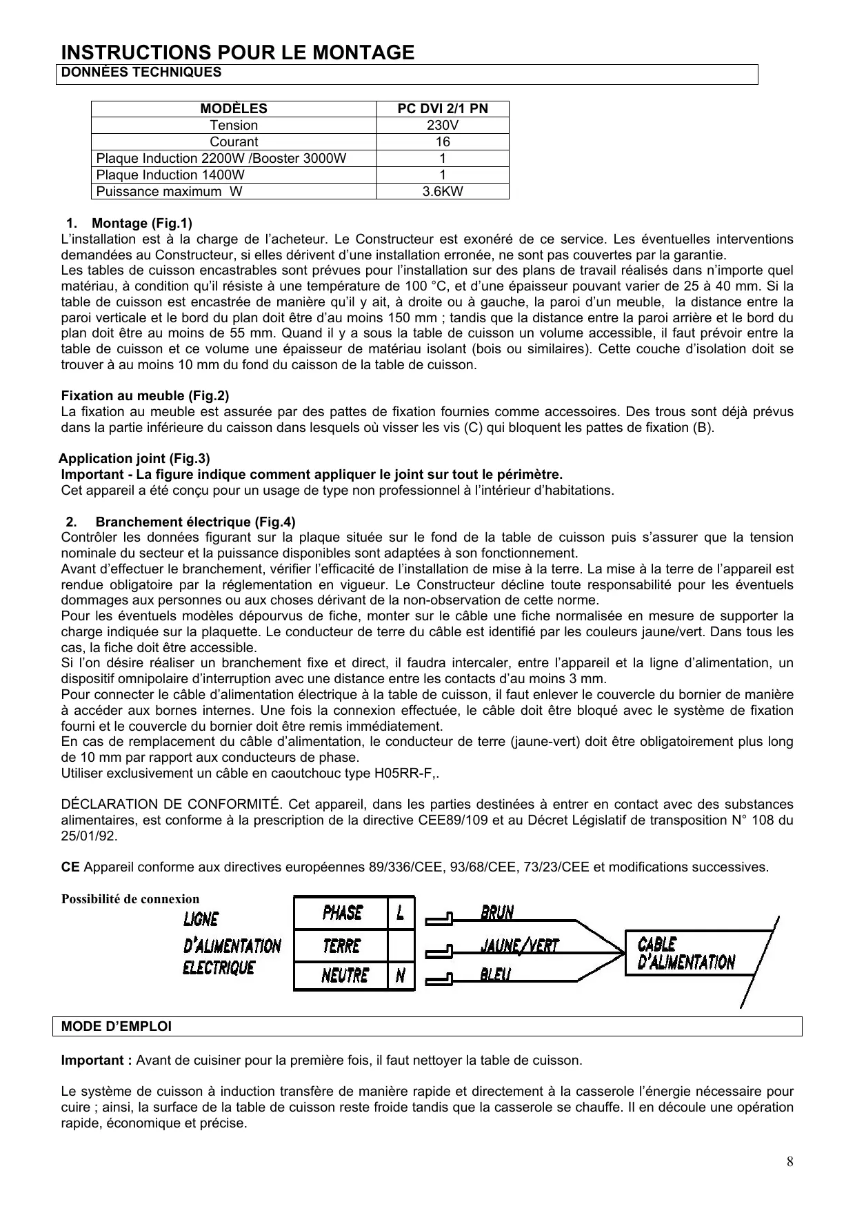 Contrôler les données figurant sur la plaque située sur le fond de la table de cuisson puis s’assurer que la tension nominale du secteur et la puissance disponibles sont adaptées à son fonctionnement. Avant d’effectuer le branchement, vérifier l’efficacité de l’installation de mise à la terre. La mise à la terre de l’appareil est rendue obligatoire par la réglementation en vigueur. Le Constructeur décline toute responsabilité pour les éventuels dommages aux personnes ou aux choses dérivant de la non-observation de cette norme. Pour les éventuels modèles dépourvus de fiche, monter sur le câble une fiche normalisée en mesure de supporter la charge indiquée sur la plaquette. Le conducteur de terre du câble est identifié par les couleurs jaune/vert. Dans tous les cas, la fiche doit être accessible. Si l’on désire réaliser un branchement fixe et direct, il faudra intercaler, entre l’appareil et la ligne d’alimentation, un dispositif omnipolaire d’interruption avec une distance entre les contacts d’au moins 3 mm. Pour connecter le câble d’alimentation électrique à la table de cuisson, il faut enlever le couvercle du bornier de manière à accéder aux bornes internes. Une fois la connexion effectuée, le câble doit être bloqué avec le système de fixation fourni et le couvercle du bornier doit être remis immédiatement. En cas de remplacement du câble d’alimentation, le conducteur de terre (jaune-vert) doit être obligatoirement plus long de 10 mm par rapport aux conducteurs de phase. Utiliser exclusivement un câble en caoutchouc type H05RR-F,. DÉCLARATION DE CONFORMITÉ. Cet appareil, dans les parties destinées à entrer en contact avec des substances alimentaires, est conforme à la prescription de la directive CEE89/109 et au Décret Législatif de transposition N° 108 du 25/01/92. CE Appareil conforme aux directives européennes 89/336/CEE, 93/68/CEE, 73/23/CEE et modifications successives. Possibilité de connexion