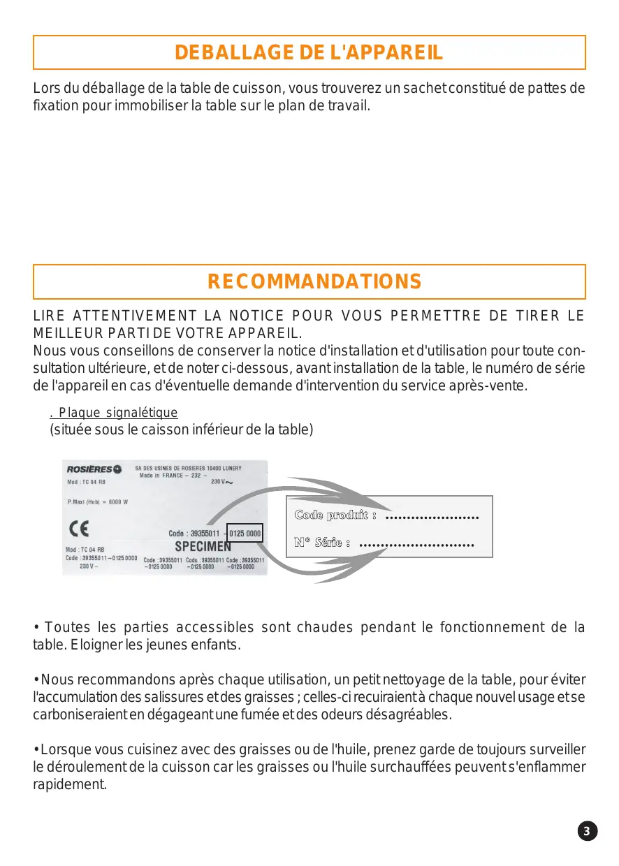 Lors du déballage de la table de cuisson, vous trouverez un sachet constitué de pattes de fixation pour immobiliser la table sur le plan de travail. RECOMMANDATIONS LIRE ATTENTIVEMENT LA NOTICE POUR VOUS PERMETTRE DE TIRER LE MEILLEUR PARTI DE VOTRE APPAREIL. Nous vous conseillons de conserver la notice d'installation et d'utilisation pour toute consultation ultérieure, et de noter ci-dessous, avant installation de la table, le numéro de série de l'appareil en cas d'éventuelle demande d'intervention du service après-vente. . Plaque signalétique (située sous le caisson inférieur de la table)
