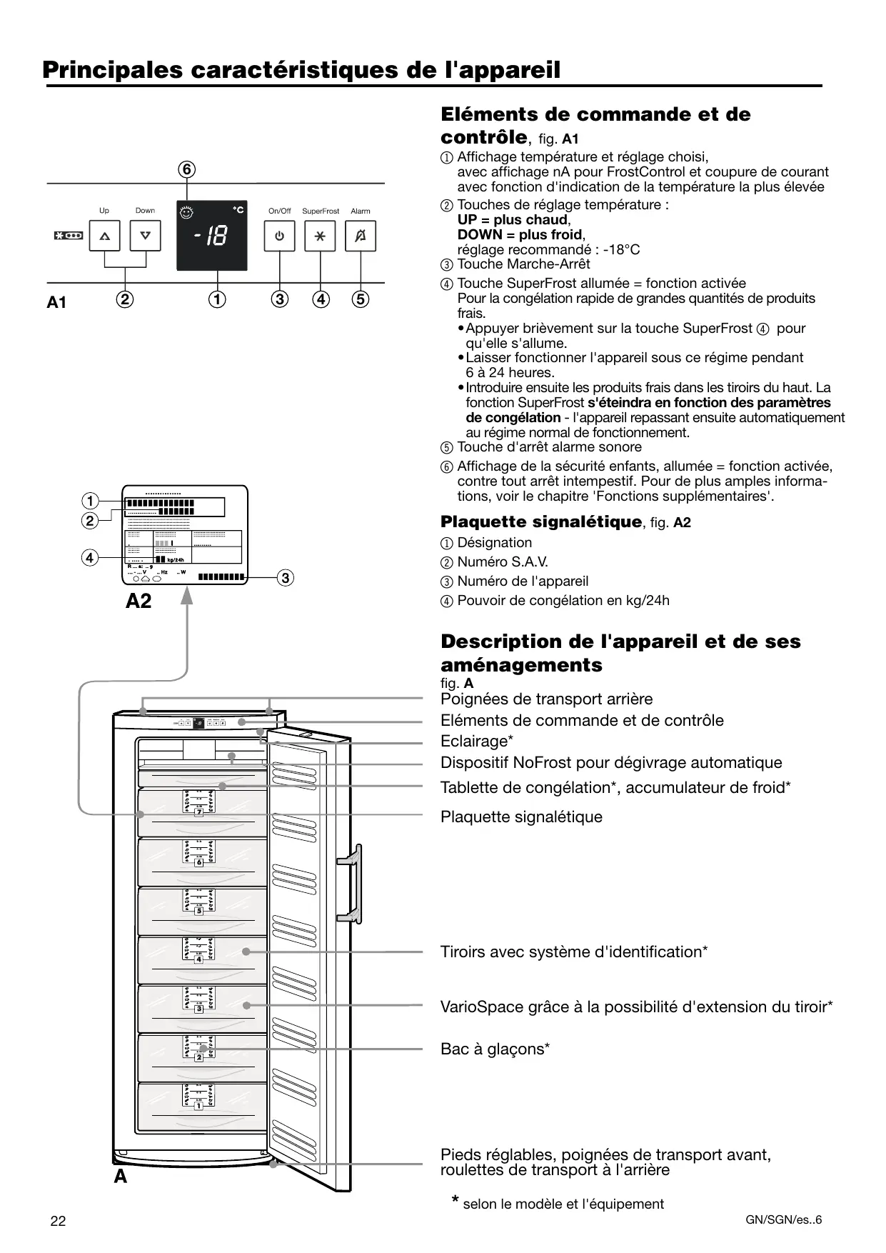 1 Désignation 2 Numéro S.A.V. 3 Numéro de l'appareil 4 Pouvoir de congélation en kg/24h Description de l'appareil et de ses aménagements