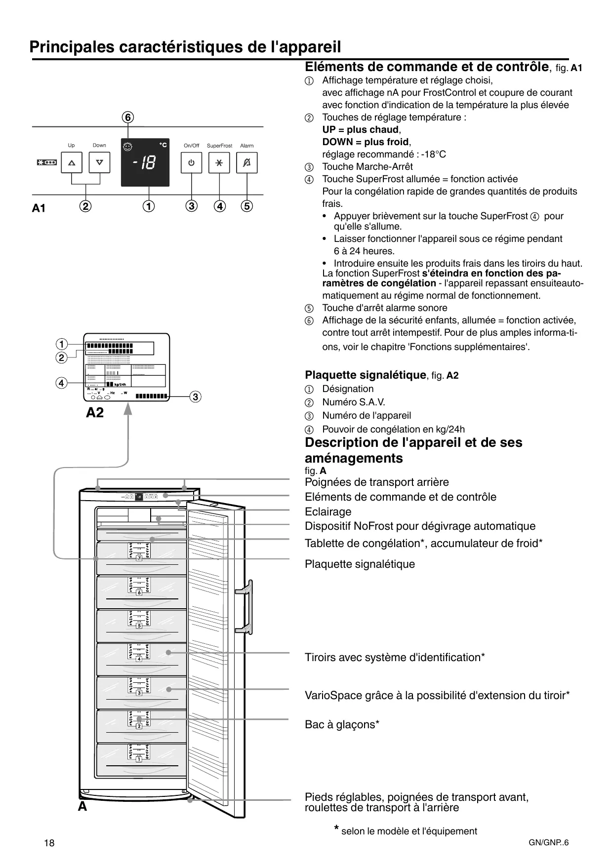 - selon le modèle et l'équipement GN/GNP..6 Vous avez fait l'acquisition d'un nouvel appareil et nous vous en félicitons. Votre choix s'est porté sur un appareil bénéficiant des techniques du froid les plus évoluées, qui garantissent à votre appareil une longue durée de vie et une sécurité d'emploi irré-prochable. L'équipement de votre appareil vous offre un niveau de confort quotidien très élevé. Par l'acquisition de cet appareil, fabriqué suivant des procédés sans danger pour l'environnement et avec des matériaux recyclables, vous apportez également votre contribution active à la protection de l'environnement. Afin de connaître tous les avantages de votre nouvel appareil, veuillez lire attentivement les consignes d'utilisation. Nous espérons que votre nouvel appareil vous donnera entière satisfaction. Nous vous prions de conserver soigneusement ces consignes d'utilisation et, le cas échéant, de les remettre au nouvel acquéreur de l'appareil si le dernier est cédé à une tierce personne. Ce mode d'emploi est valable pour plusieurs appareils, des différences sont par conséquent possibles. Sommaire Page Consignes d'utilisation Principales caractéristiques de l'appareil............ 18 Sommaire ........................................................... 19 Prescriptions ...................................................... 19 Recommandations pour l'économie d'énergie........................................... 19 Recommandations et consignes de sécurité ........... 20 Protection de l'environnement ............................ 20 Mise en place ..................................................... 20 Raccordement électrique ................................... 21 Mise en service et éléments de contrôle .................. 21 Mise en marche et arrêt de l'appareil .................. 21 Réglage de la température ................................. 21 Affichage de la température ............................... 21 Alarme sonore .................................................... 21 Coupure de courant/affichage FrostControl ........ 21 Fonctions supplémentaires - sécurité enfants .... 21 Intensité lumineuse de l'affichage* ..................... 21 SuperFrost ............................................................... 22 Conseils pour la congélation et la conservation ................................................. 22 Equipement ............................................................. 23 Système d'identification ...................................... 23 Tablette de congélation ...................................... 23 Accumulateurs de froid ....................................... 23 Préparation de glaçons....................................... 23 VarioSpace* ....................................................... 23 Eclairage ............................................................ 23 Nettoyage ................................................................ 23 Pannes éventuelles - problèmes .............................. 24 Plaquette signalétique et S.A.V. .......................... 24 Mise en place et instructions de montage Dimensions ........................................................ 24 Inversion du sens d'ouverture de la porte ........... 24 GN/GNP..6