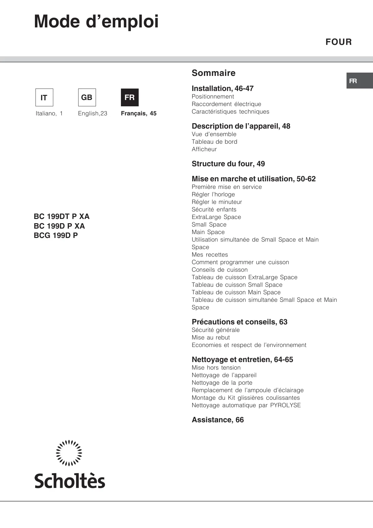 BC 199DT P XA - Four SCHOLTES - Notice d'utilisation et mode d'emploi gratuit