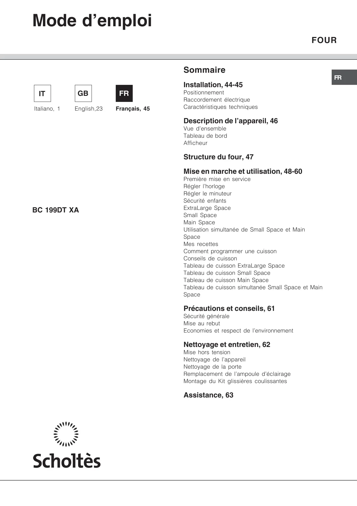 BC 199DT XA - Four SCHOLTES - Notice d'utilisation et mode d'emploi gratuit