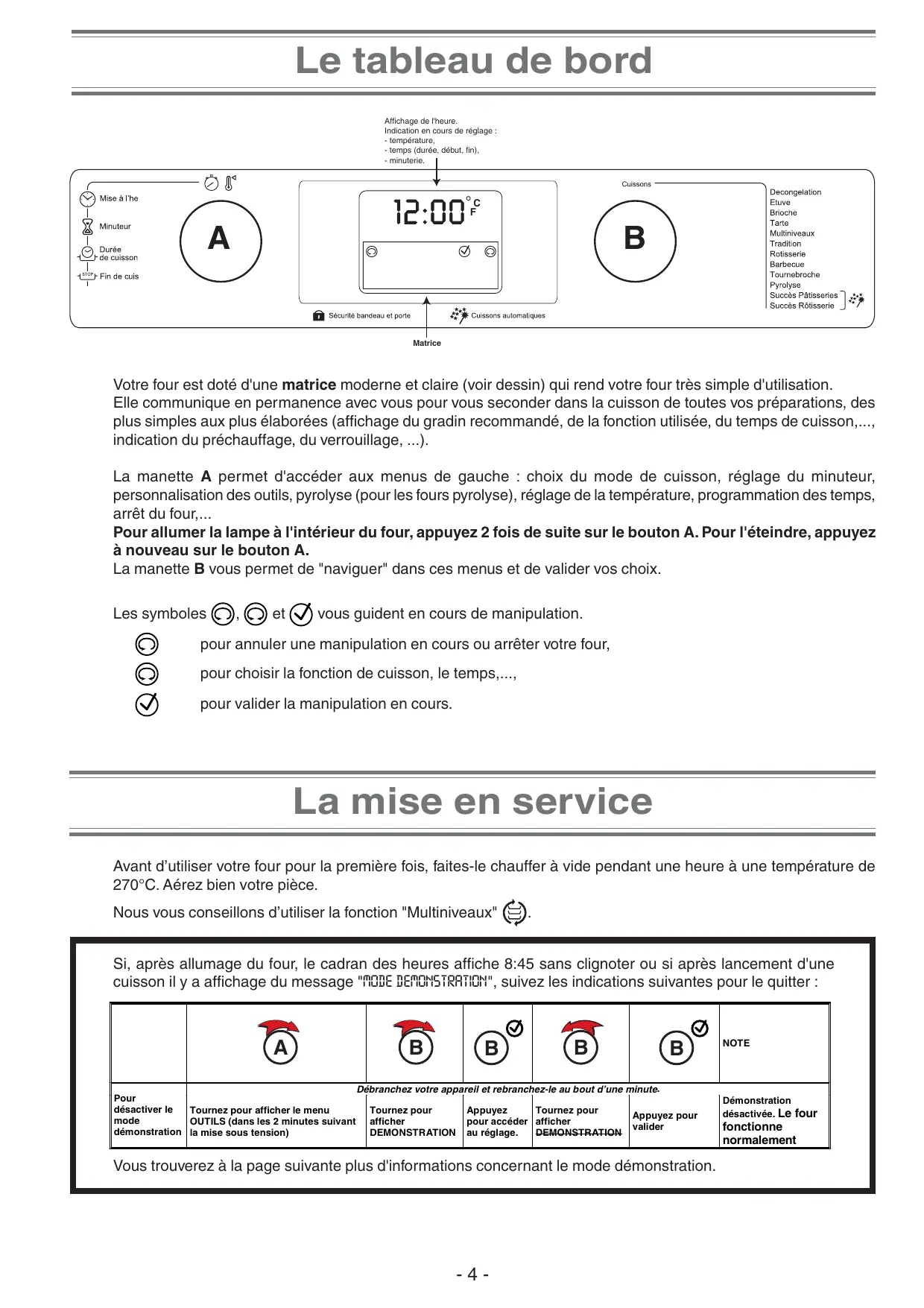 Matrice Votre four est doté d'une matrice moderne et claire (voir dessin) qui rend votre four très simple d'utilisation. Elle communique en permanence avec vous pour vous seconder dans la cuisson de toutes vos préparations, des plus simples aux plus élaborées (affichage du gradin recommandé, de la fonction utilisée, du temps de cuisson,..., indication du préchauffage, du verrouillage, ...). La manette A permet d'accéder aux menus de gauche : choix du mode de cuisson, réglage du minuteur, personnalisation des outils, pyrolyse (pour les fours pyrolyse), réglage de la température, programmation des temps, arrêt du four,... Pour allumer la lampe à l'intérieur du four, appuyez 2 fois de suite sur le bouton A. Pour l'éteindre, appuyez à nouveau sur le bouton A. La manette B vous permet de "naviguer" dans ces menus et de valider vos choix. Les symboles