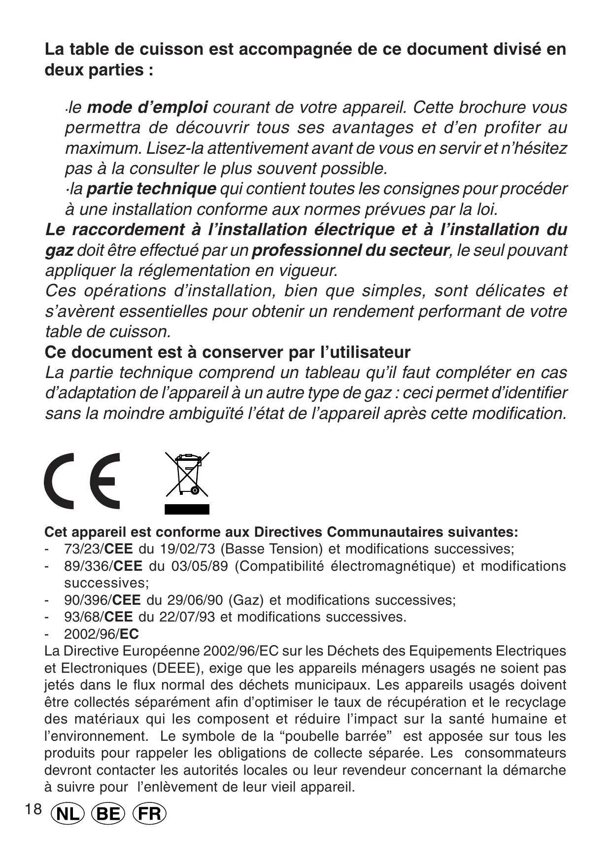 Cet appareil est conforme aux Directives Communautaires suivantes: - 73/23/CEE du 19/02/73 (Basse Tension) et modifications successives; - 89/336/CEE du 03/05/89 (Compatibilité électromagnétique) et modifications successives; - 90/396/CEE du 29/06/90 (Gaz) et modifications successives; - 93/68/CEE du 22/07/93 et modifications successives. - 2002/96/EC La Directive Européenne 2002/96/EC sur les Déchets des Equipements Electriques et Electroniques (DEEE), exige que les appareils ménagers usagés ne soient pas jetés dans le flux normal des déchets municipaux. Les appareils usagés doivent être collectés séparément afin d’optimiser le taux de récupération et le recyclage des matériaux qui les composent et réduire l’impact sur la santé humaine et l’environnement. Le symbole de la ‘‘poubelle barrée’’ est apposée sur tous les produits pour rappeler les obligations de collecte séparée. Les consommateurs devront contacter les autorités locales ou leur revendeur concernant la démarche à suivre pour l’enlèvement de leur vieil appareil.