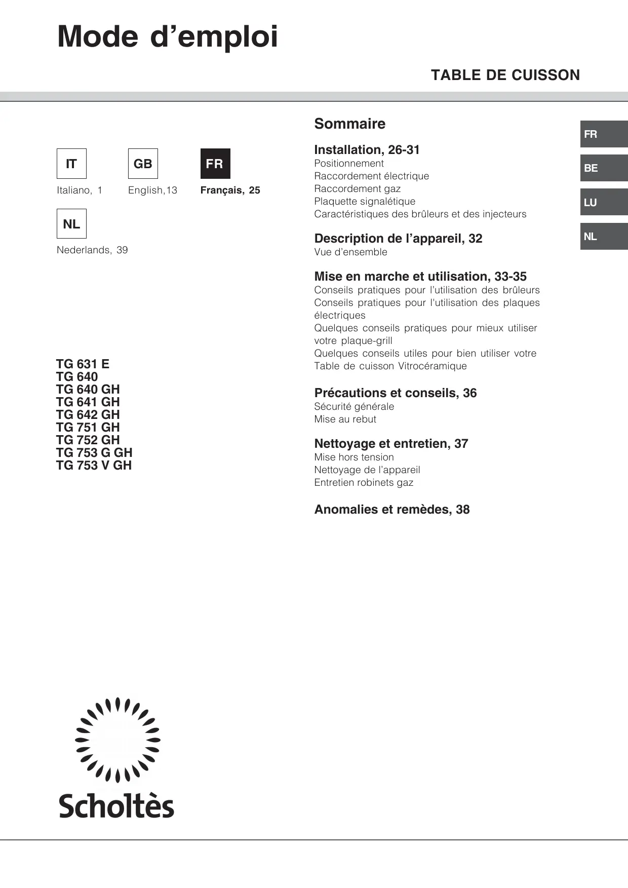 Retrouvez gratuitement la notice de l'appareil TG 752 GH SCHOLTES au format PDF.