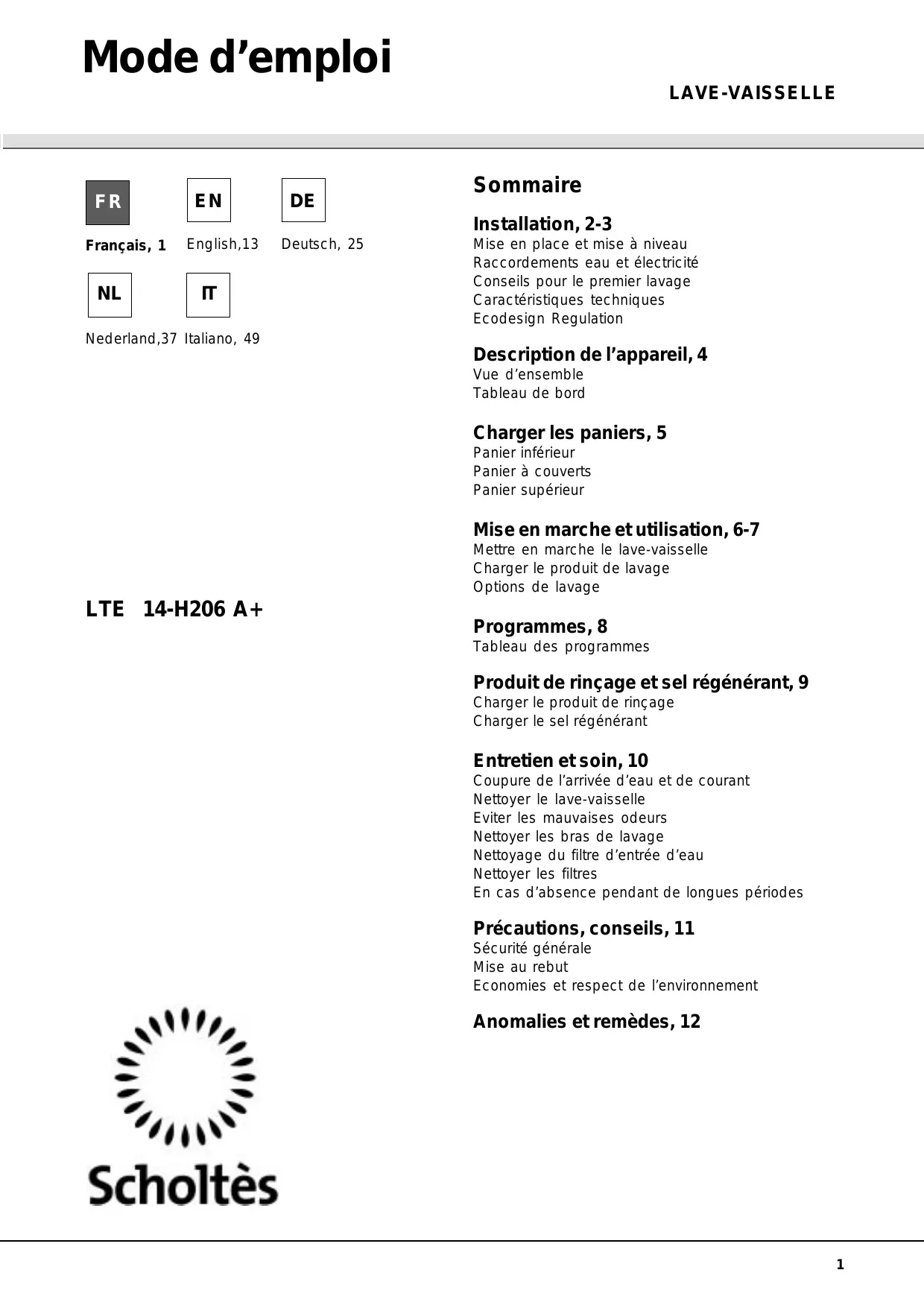 LTE 14-H206 A - Lave-vaisselle SCHOLTES - Notice d'utilisation et mode d'emploi gratuit