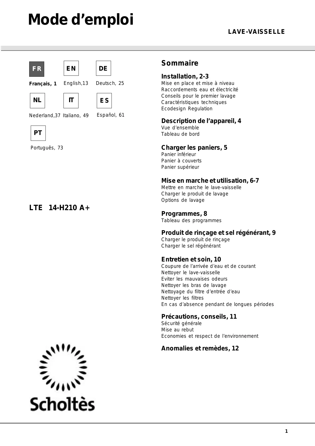 LTE 14-H210 A .R - Lave-vaisselle SCHOLTES - Notice d'utilisation et mode d'emploi gratuit