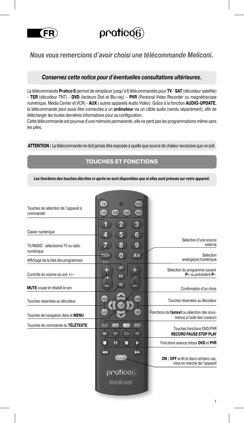 Nous vous remercions d'avoir choisi une télécommande Meliconi. Conservez cette notice pour d'éventuelles consultations ultérieures. La télécommande Pratico 6 permet de remplacer jusqu’à 6 télécommandes pour TV - SAT (décodeur satellite) - TER (décodeur TNT) - DVD (lecteurs Dvd et Blu-ray) – PVR (Personal Video Recorder ou magnétoscope numérique, Media Center et VCR) - AUX ( autres appareils Audio Vidéo). Grâce à la fonction AUDIO-UPDATE, la télécommande peut aussi être connectée à un ordinateur via un câble audio (vendu séparément), afin de télécharger les toutes dernières informations pour sa configuration. Cette télécommande est pourvue d'une mémoire permanente, elle ne perd pas les programmations même sans les piles. ATTENTION : La télécommande ne doit jamais être exposée à quelle que source de chaleur excessive que ce soit.