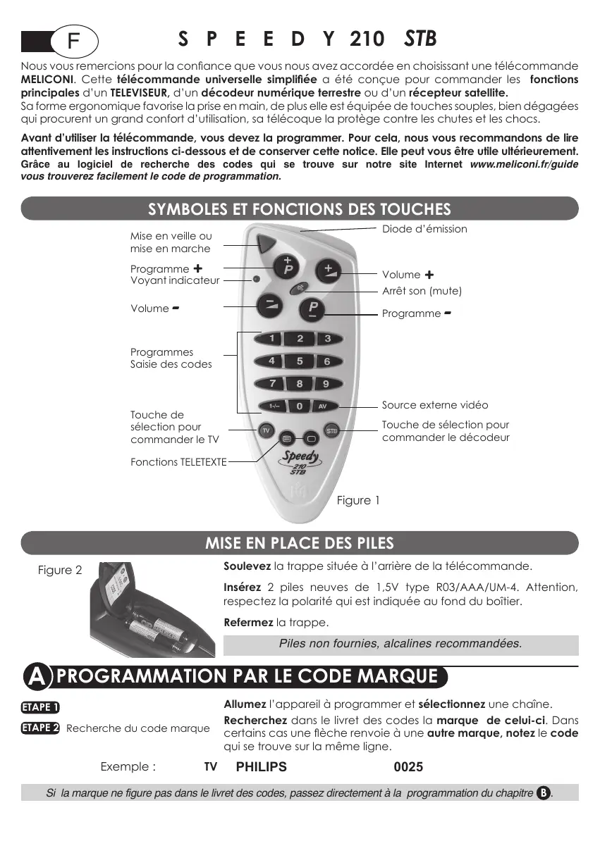 Nous vous remercions pour la confiance que vous nous avez accordée en choisissant une télécommande MELICONI. Cette télécommande universelle simplifiée a été conçue pour commander les fonctions principales d’un TELEVISEUR, d’un décodeur numérique terrestre ou d’un récepteur satellite. Sa forme ergonomique favorise la prise en main, de plus elle est équipée de touches souples, bien dégagées qui procurent un grand confort d’utilisation, sa télécoque la protège contre les chutes et les chocs. Avant d’utiliser la télécommande, vous devez la programmer. Pour cela, nous vous recommandons de lire attentivement les instructions ci-dessous et de conserver cette notice. Elle peut vous être utile ultérieurement. Grâce au logiciel de recherche des codes qui se trouve sur notre site Internet www.meliconi.fr/guide vous trouverez facilement le code de programmation.