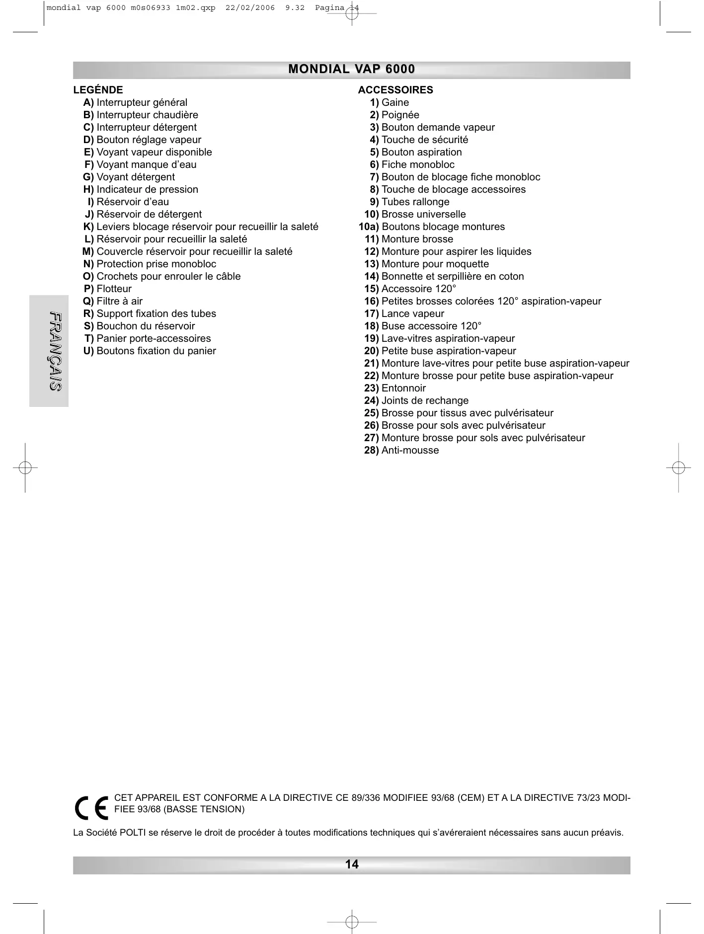 MODE D'EMPLOI MONDIAL VAP 6000 POLTI