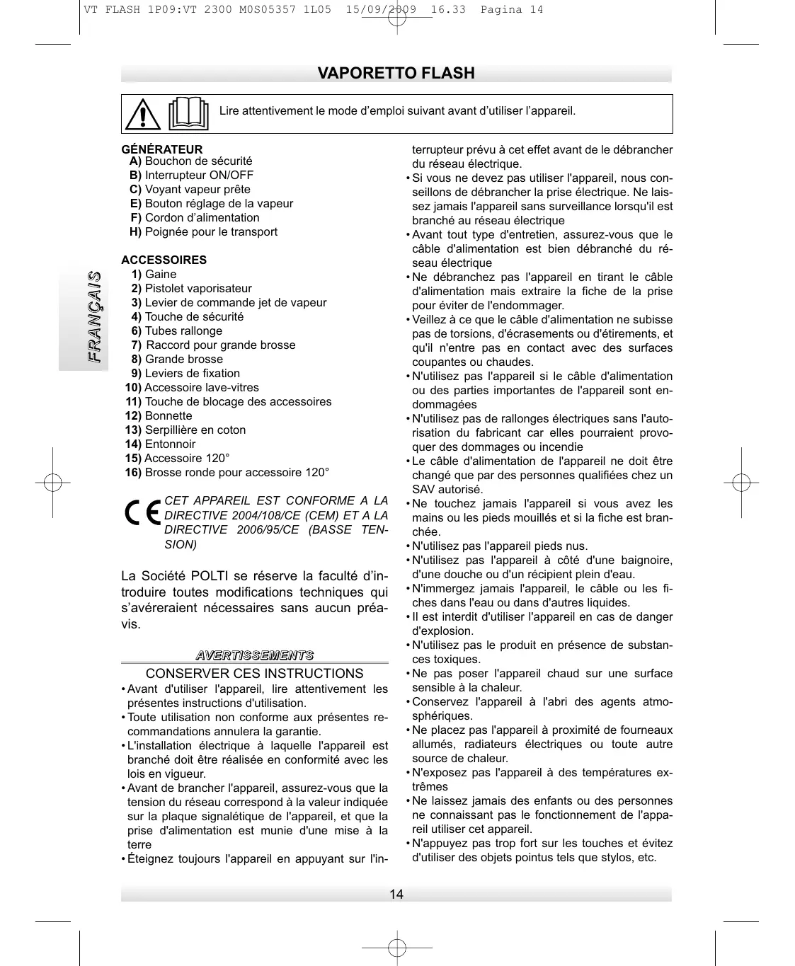 DIRECTIVE 2006/95/CE (BASSE TENSION) La Société POLTI se réserve la faculté d’introduire toutes modifications techniques qui s’avéreraient nécessaires sans aucun préavis. AV E R T I S S E M E N T S