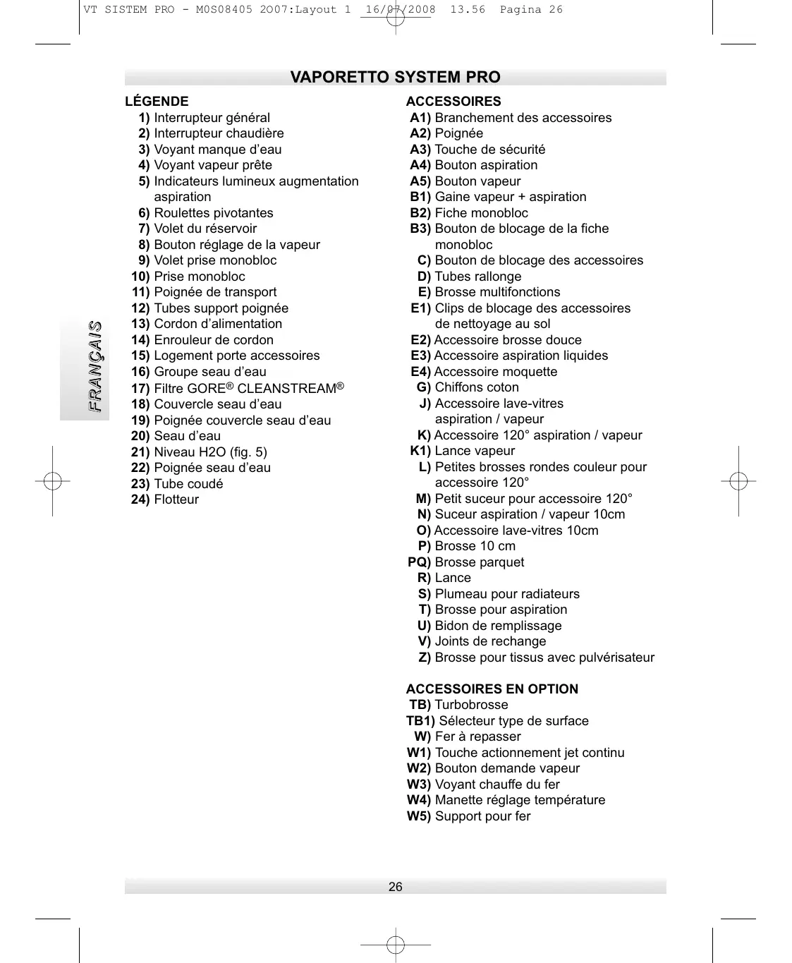 FRANÇAIS Lire attentivement le mode d’emploi suivant avant d’utiliser l’appareil. VT SISTEM PRO - M0S08405 2O07:Layout 1 16/07/2008