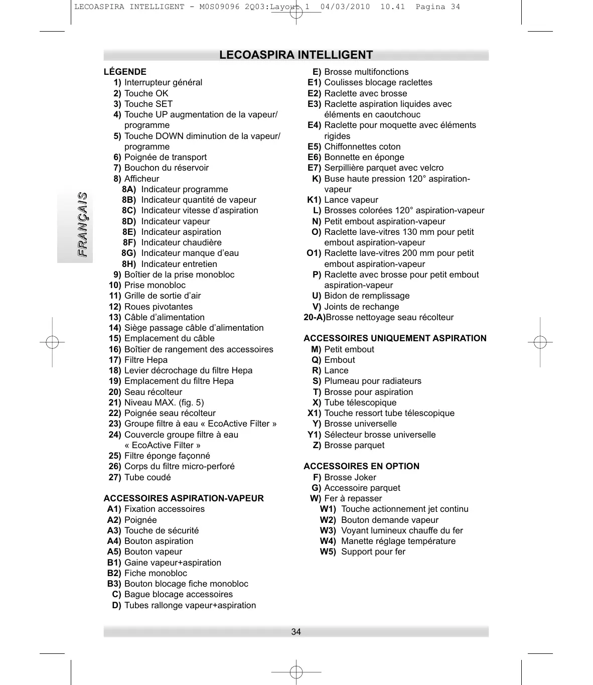 • Il est conseillé d’utiliser le petit embout (N), la raclette avec brosse (P) et la bonnette en éponge (E6). REMARQUE : la vitesse d’aspiration et la quantité de vapeur sont pré-réglées et il est donc impossible de les modifier manuellement. Avant de traiter les surfaces avec la vapeur, il est conseillé d’aspirer les poils et la poussière en n’utilisant que la fonction aspiration en mode manuel MA. LECOASPIRA INTELLIGENT - M0S09096 2Q03:Layout 1 04/03/2010