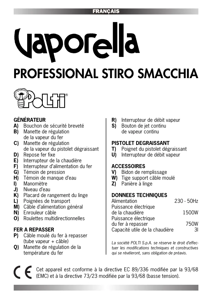 MODE D'EMPLOI VAPORELLA STIRO SMACCHIA POLTI