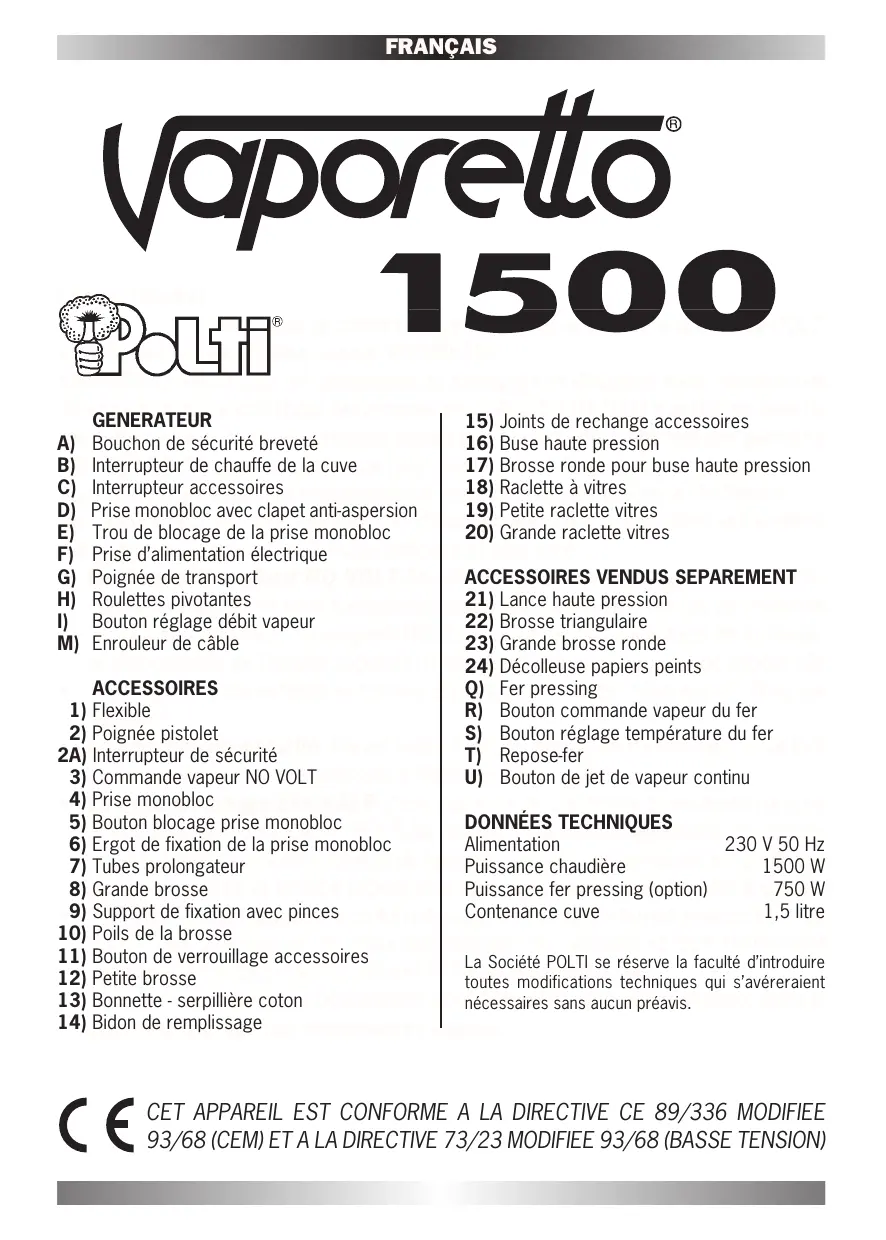MODE D'EMPLOI VAPORETTO 1500 POLTI