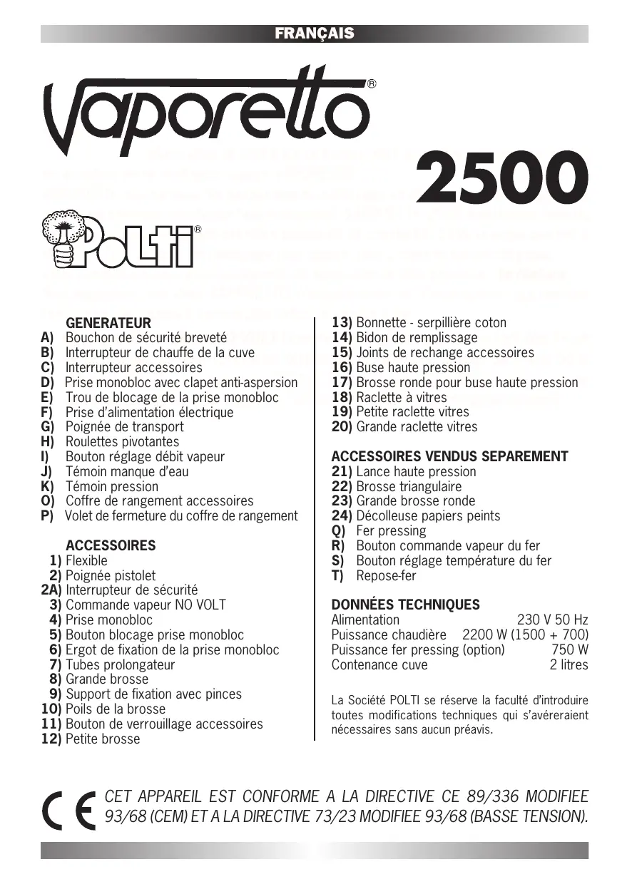 MODE D'EMPLOI VAPORETTO 2500 POLTI