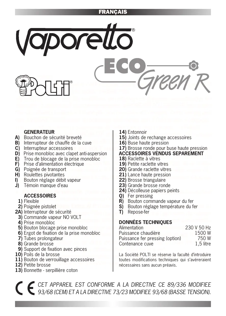 Cher(e) Client(e) Merci pour la confiance que vous avez accordée à la marque POLTI en achetant votre nettoyeur vapeur VAPORETTO. VAPORETTO résout tous les problèmes de nettoyage et d’hygiène sans utilisation de détergent chimique nocif pour l’environnement. VAPORETTO ECO GREEN R transforme l’eau du robinet en vapeur sous une pression puissante et constante. Cette énergie permet à VAPORETTO d’assurer un nettoyage plus rapide, plus à fond et plus écologique. Vous contribuez ainsi à la sauvegarde de notre bien le plus précieux : la Nature.