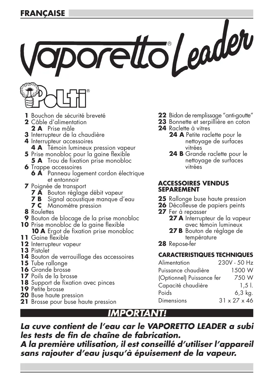 VAPORETTO LEADER - Nettoyeur vapeur POLTI - Notice d'utilisation et mode d'emploi gratuit