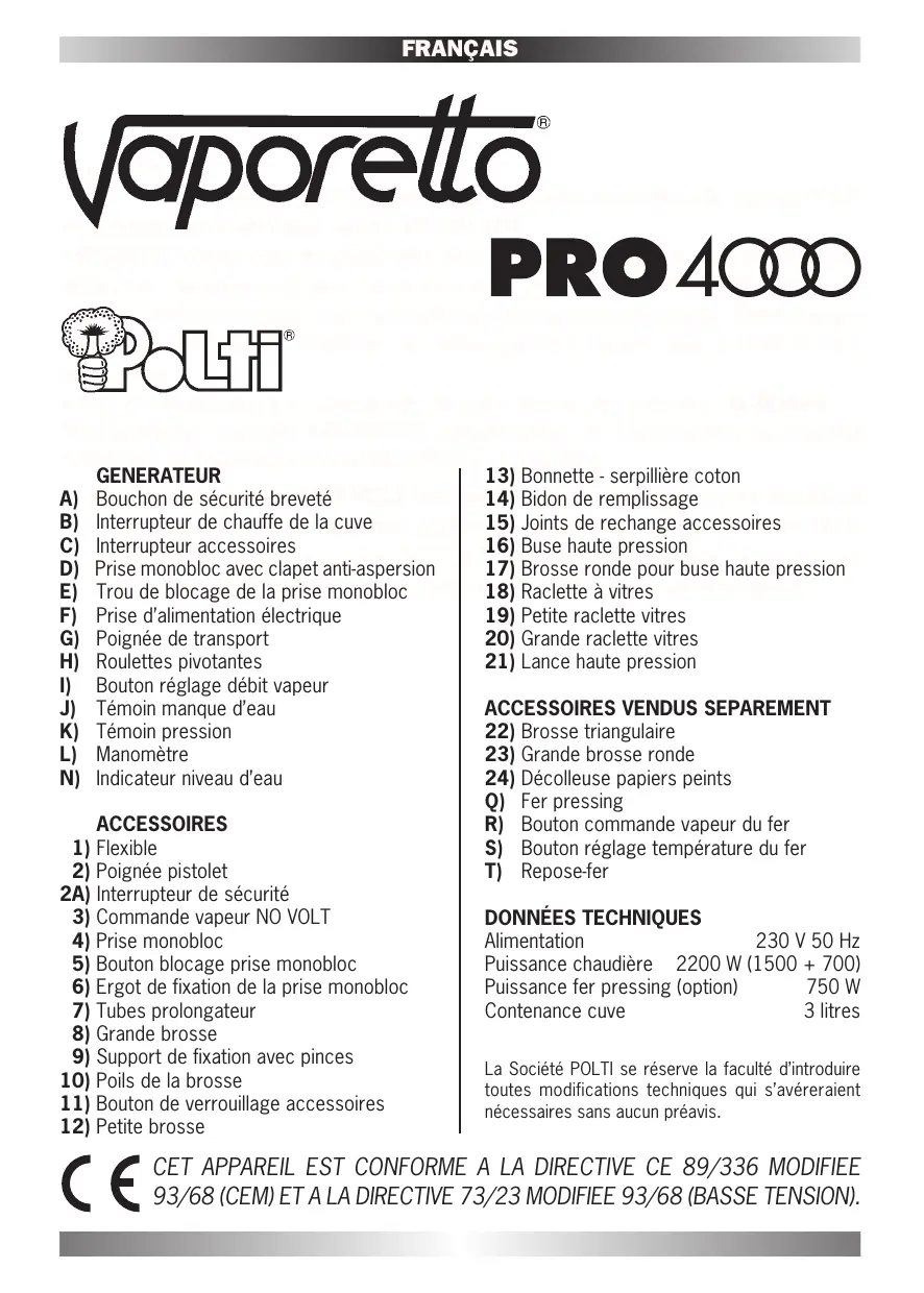 MODE D'EMPLOI VAPORETTO PRO 4000 POLTI