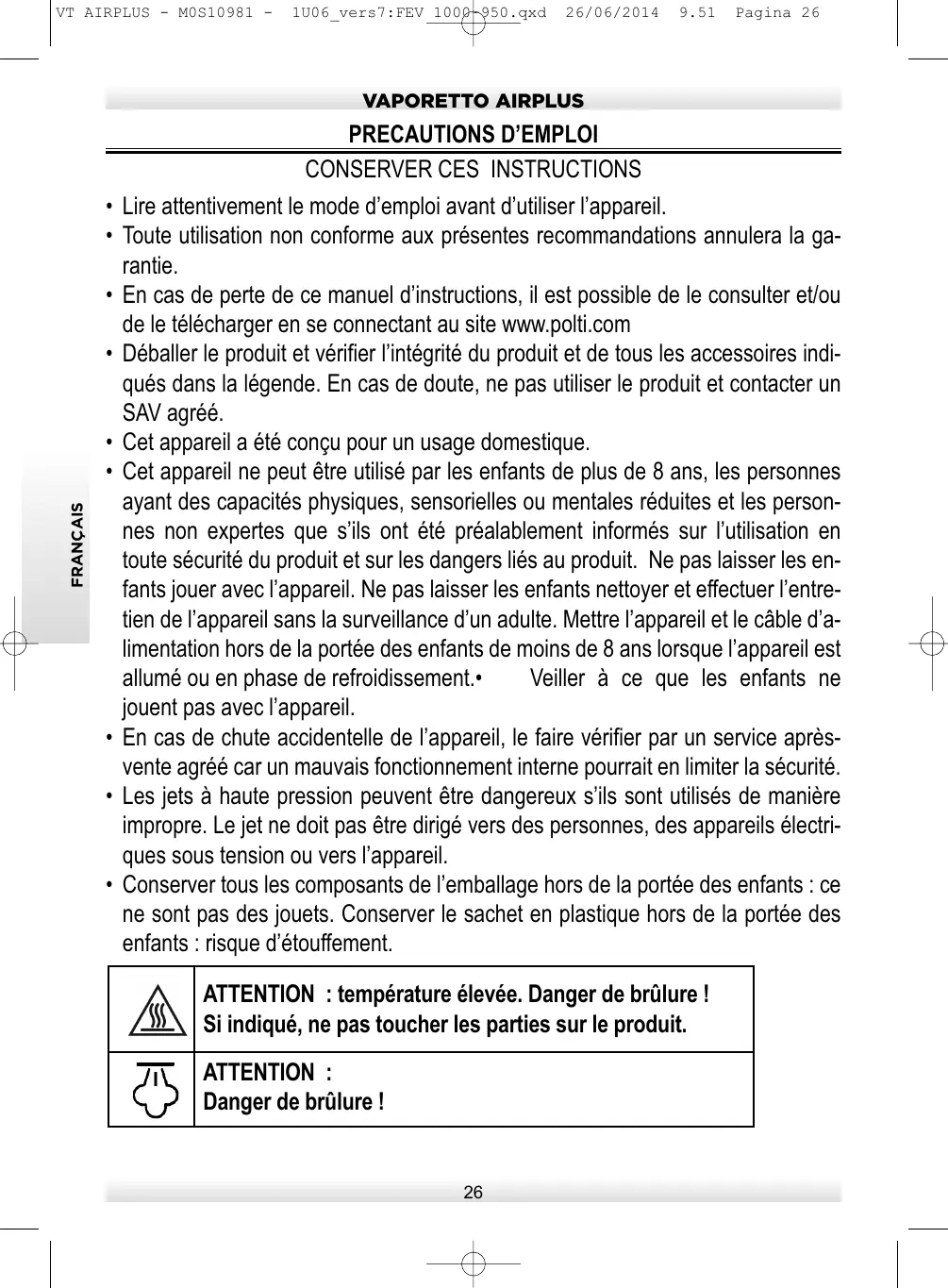 Lire attentivement le mode d’emploi avant d’utiliser l’appareil. Toute utilisation non conforme aux présentes recommandations annulera la garantie. En cas de perte de ce manuel d’instructions, il est possible de le consulter et/ou de le télécharger en se connectant au site www.polti.com Déballer le produit et vérifier l’intégrité du produit et de tous les accessoires indiqués dans la légende. En cas de doute, ne pas utiliser le produit et contacter un SAV agréé. Cet appareil a été conçu pour un usage domestique. Cet appareil ne peut être utilisé par les enfants de plus de 8 ans, les personnes ayant des capacités physiques, sensorielles ou mentales réduites et les personnes non expertes que s’ils ont été préalablement informés sur l’utilisation en toute sécurité du produit et sur les dangers liés au produit. Ne pas laisser les enfants jouer avec l’appareil. Ne pas laisser les enfants nettoyer et effectuer l’entretien de l’appareil sans la surveillance d’un adulte. Mettre l’appareil et le câble d’alimentation hors de la portée des enfants de moins de 8 ans lorsque l’appareil est allumé ou en phase de refroidissement.• Veiller à ce que les enfants ne jouent pas avec l’appareil. En cas de chute accidentelle de l’appareil, le faire vérifier par un service aprèsvente agréé car un mauvais fonctionnement interne pourrait en limiter la sécurité. Les jets à haute pression peuvent être dangereux s’ils sont utilisés de manière impropre. Le jet ne doit pas être dirigé vers des personnes, des appareils électriques sous tension ou vers l’appareil. Conserver tous les composants de l’emballage hors de la portée des enfants : ce ne sont pas des jouets. Conserver le sachet en plastique hors de la portée des enfants : risque d’étouffement. ATTENTION : température élevée. Danger de brûlure ! Si indiqué, ne pas toucher les parties sur le produit. ATTENTION : Danger de brûlure !