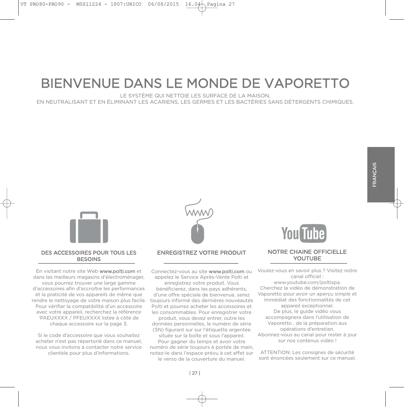 YOUTUBE En visitant notre site Web www.polti.com et Connectez-vous au site www.polti.com ou Voulez-vous en savoir plus ? Visitez notre canal officiel : dans les meilleurs magasins d’électroménager, appelez le Service Après-Vente Polti et www.youtube.com/poltispa. vous pourrez trouver une large gamme enregistrez votre produit. Vous Cherchez la vidéo de démonstration de d'accessoires afin d'accroître les performances bénéficierez, dans les pays adhérents, Vaporetto pour avoir un aperçu simple et et la praticité de vos appareils de même que d’une offre spéciale de bienvenue, serez immédiat des fonctionnalités de cet rendre le nettoyage de votre maison plus facile. toujours informé des dernières nouveautés appareil exceptionnel. Pour vérifier la compatibilité d’un accessoire Polti et pourrez acheter les accessoires et De plus, le guide vidéo vous avec votre appareil, recherchez la référence les consommables. Pour enregistrer votre accompagnera dans l’utilisation de 'PAEUXXXX / PFEUXXXX listée à côté de produit, vous devez entrer, outre les Vaporetto , de la préparation aux chaque accessoire sur la page 3. données personnelles, le numéro de série opérations d’entretien. (SN) figurant sur sur l’étiquette argentée Abonnez-vous au canal pour rester à jour Si le code d'accessoire que vous souhaitez située sur la boîte et sous l’appareil. sur nos contenus vidéo ! acheter n’est pas répertorié dans ce manuel, Pour gagner du temps et avoir votre nous vous invitons à contacter notre service numéro de série toujours à portée de main, clientèle pour plus d'informations. notez-le dans l’espace prévu à cet effet sur ATTENTION: Les consignes de sécurité sont énoncées seulement sur ce manuel. le verso de la couverture du manuel. | 27 |