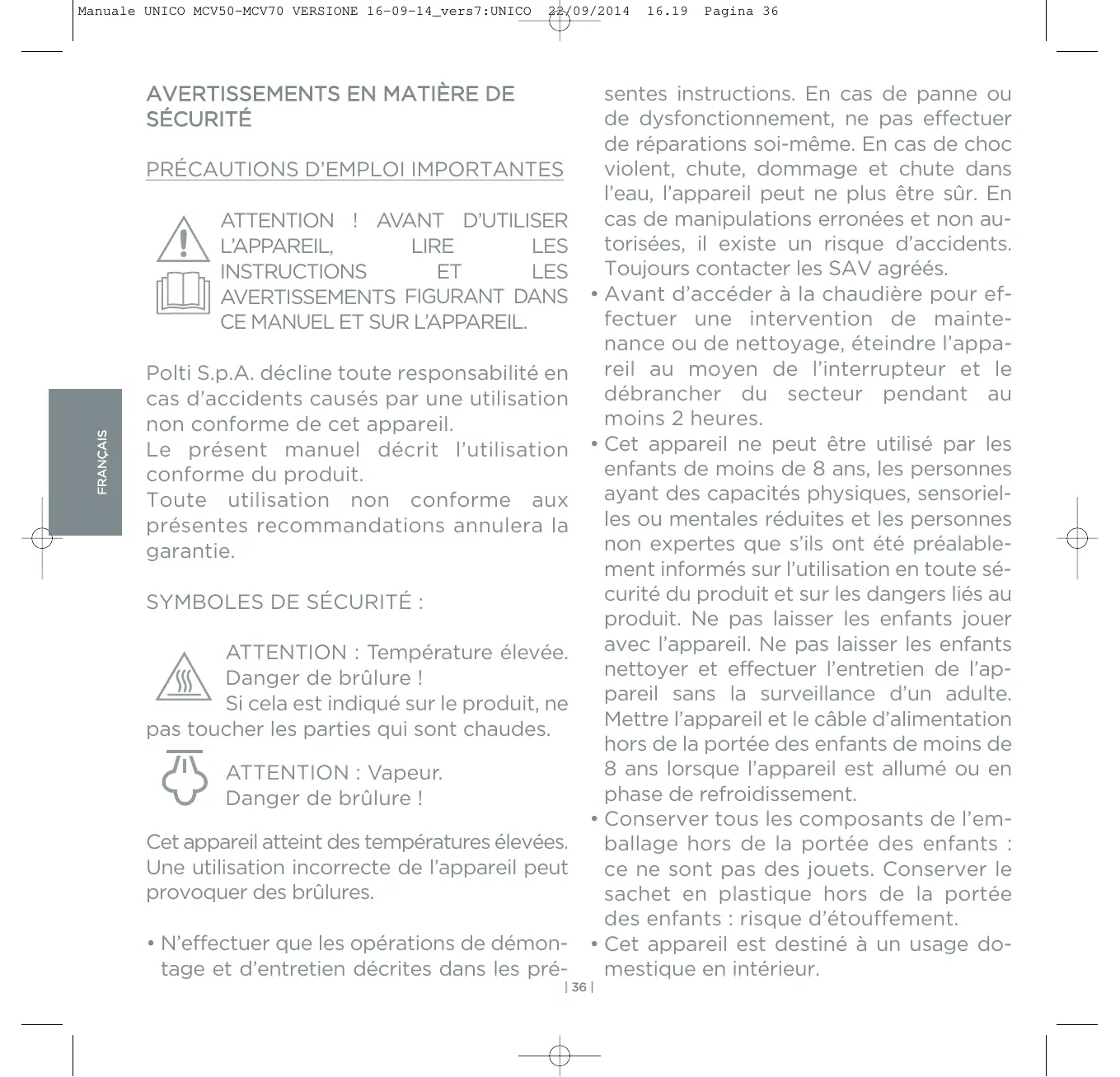 l’eau, l’appareil peut ne plus être sûr. En cas de manipulations erronées et non auATTENTION ! AVANT D’UTILISER torisées, il existe un risque d’accidents. L’APPAREIL, LIRE LES Toujours contacter les SAV agréés. INSTRUCTIONS LES Avant d’accéder à la chaudière pour efAVERTISSEMENTS FIGURANT DANS fectuer une intervention de mainteCE MANUEL ET SUR L’APPAREIL. nance ou de nettoyage, éteindre l’appareil au moyen de l’interrupteur et le Polti S.p.A. décline toute responsabilité en débrancher du secteur pendant au cas d’accidents causés par une utilisation moins 2 heures. non conforme de cet appareil. Cet appareil ne peut être utilisé par les Le présent manuel décrit l’utilisation enfants de moins de 8 ans, les personnes conforme du produit. ayant des capacités physiques, sensorielToute utilisation non conforme aux les ou mentales réduites et les personnes présentes recommandations annulera la non expertes que s’ils ont été préalablegarantie. ment informés sur l’utilisation en toute sécurité du produit et sur les dangers liés au SYMBOLES DE SÉCURITÉ : produit. Ne pas laisser les enfants jouer avec l’appareil. Ne pas laisser les enfants ATTENTION : Température élevée. nettoyer et effectuer l’entretien de l’apDanger de brûlure ! pareil sans la surveillance d’un adulte. Si cela est indiqué sur le produit, ne Mettre l’appareil et le câble d’alimentation pas toucher les parties qui sont chaudes. hors de la portée des enfants de moins de 8 ans lorsque l’appareil est allumé ou en ATTENTION : Vapeur. phase de refroidissement. Danger de brûlure !