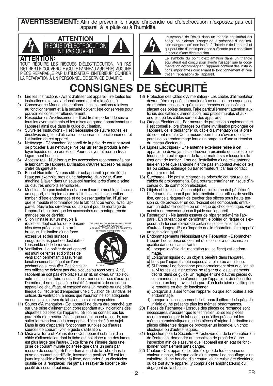 est muni de fentes et d’orifices de ventilation permettant d’assurer un fonctionnement adéquat en l’emS3125A pêchant de surchauffer. Ces fentes et ces orifices ne doivent pas être bloqués ou recouverts. Ainsi, l’appareil ne doit pas être placé sur un lit, un divan, un tapis ou autre surface similaire risquant d’obstruer ces orifices d’aération. De même, il ne doit pas être installé à proximité de ou sur un appareil de chauffage, ni encastré dans un meuble ou une bibliothèque qui risquerait d’empêcher une circulation de l’air dans les orifices de ventilation, à moins que l’aération ne soit adéquante ou que les directives du fabricant ne soient respectées.