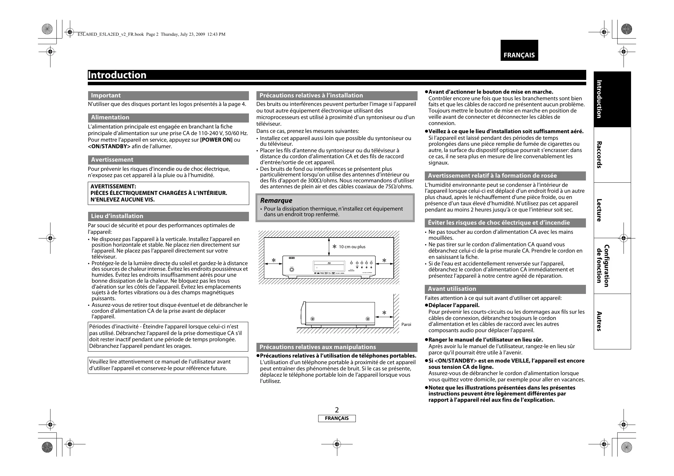 - Spécifications E5LA0ED_E5LA2ED_v2_FR.book Page 2 Thursday, July 23, 2009 12:43 PM FRANÇAIS Important N’utiliser que des disques portant les logos présentés à la page 4. Alimentation Avertissement Pour prévenir les risques d’incendie ou de choc électrique, n’exposez pas cet appareil à la pluie ou à l’humidité. Lieu d’installation Veuillez lire attentivement ce manuel de I’utilisateur avant d’utiliser l’appareil et conservez-le pour référence future. Éviter les risques de choc électrique et d’incendie p. 48