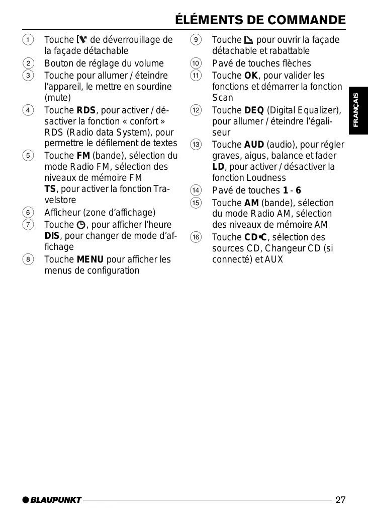 Touche pour ouvrir la façade détachable et rabattable Pavé de touches flèches Touche OK, pour valider les fonctions et démarrer la fonction Scan Touche DEQ (Digital Equalizer), pour allumer / éteindre l’égaliseur Touche AUD (audio), pour régler graves, aigus, balance et fader LD, pour activer / désactiver la fonction Loudness Pavé de touches 1 - 6 Touche AM (bande), sélection du mode Radio AM, sélection des niveaux de mémoire AM Touche CD•C, sélection des sources CD, Changeur CD (si connecté) et AUX