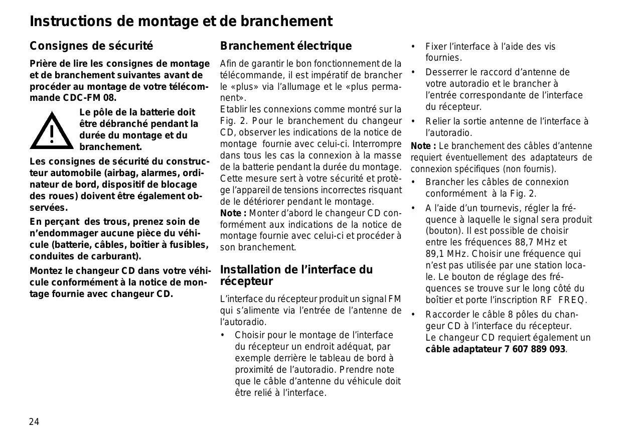 (bouton). Il est possible de choisir entre les fréquences 88,7 MHz et 89,1 MHz. Choisir une fréquence qui n’est pas utilisée par une station locale. Le bouton de réglage des fréquences se trouve sur le long côté du boîtier et porte l’inscription RF FREQ. Raccorder le câble 8 pôles du changeur CD à l’interface du récepteur. Le changeur CD requiert également un câble adaptateur 7 607 889 093.