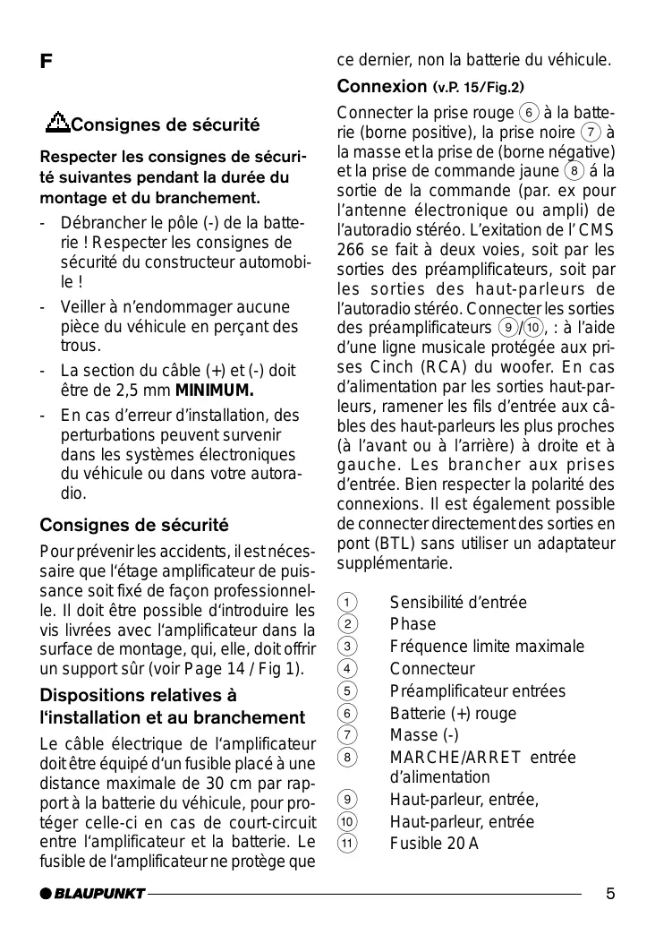 Connexion (v.P. 15/Fig.2) Consignes de sécurité Respecter les consignes de sécurité suivantes pendant la durée du montage et du branchement. - Débrancher le pôle (-) de la batterie ! Respecter les consignes de sécurité du constructeur automobile ! - Veiller à n’endommager aucune pièce du véhicule en perçant des trous. - La section du câble (+) et (-) doit être de 2,5 mm MINIMUM. - En cas d’erreur d’installation, des perturbations peuvent survenir dans les systèmes électroniques du véhicule ou dans votre autoradio. Consignes de sécurité Pour prévenir les accidents, il est nécessaire que l‘étage amplificateur de puissance soit fixé de façon professionnelle. Il doit être possible d‘introduire les vis livrées avec l‘amplificateur dans la surface de montage, qui, elle, doit offrir un support sûr (voir Page 14 / Fig 1). Dispositions relatives à l‘installation et au branchement Le câble électrique de l‘amplificateur doit être équipé d‘un fusible placé à une distance maximale de 30 cm par rapport à la batterie du véhicule, pour protéger celle-ci en cas de court-circuit entre l‘amplificateur et la batterie. Le fusible de l‘amplificateur ne protège que Connecter la prise rouge 6 à la batterie (borne positive), la prise noire 7 à la masse et la prise de (borne négative) et la prise de commande jaune 8 á la sortie de la commande (par. ex pour l’antenne électronique ou ampli) de l’autoradio stéréo. L’exitation de l’ CMS 266 se fait à deux voies, soit par les sorties des préamplificateurs, soit par les sorties des haut-parleurs de l’autoradio stéréo. Connecter les sorties des préamplificateurs 9/:, : à l’aide d’une ligne musicale protégée aux prises Cinch (RCA) du woofer. En cas d’alimentation par les sorties haut-parleurs, ramener les fils d’entrée aux câbles des haut-parleurs les plus proches (à l’avant ou à l’arrière) à droite et à gauche. Les brancher aux prises d’entrée. Bien respecter la polarité des connexions. Il est également possible de connecter directement des sorties en pont (BTL) sans utiliser un adaptateur supplémentarie.