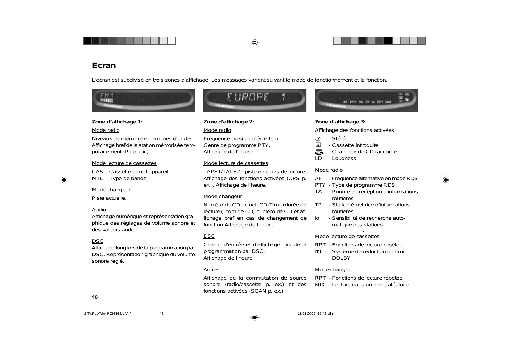 Audio Affichage numérique et représentation graphique des réglages de volume sonore et des valeurs audio. DSC Affichage long lors de la programmation par DSC. Représentation graphique du volume sonore réglé. Mode radio Numéro de CD actuel, CD-Time (durée de lecture), nom de CD, numéro de CD et affichage bref en cas de changement de fonction.Affichage de l‘heure. AF - Fréquence alternative en mode RDS PTY - Type de programme RDS TA - Priorité de réception d‘informations routières TP - Station émettrice d‘informations routières - Sensibilité de recherche automatique des stations DSC Mode lecture de cassettes Champ d‘entrée et d‘affichage lors de la programmation par DSC. Affichage de l‘heure RPT - Fonctions de lecture répétée - Système de réduction de bruit DOLBY Autres Mode changeur Affichage de la commutation de source sonore (radio/cassette p. ex.) et des fonctions activées (SCAN p. ex.). RPT - Fonctions de lecture répétée MIX - Lecture dans un ordre aléatoire Mode changeur Piste actuelle. - Stéréo - Cassette introduite - Changeur de CD raccordé - Loudness
