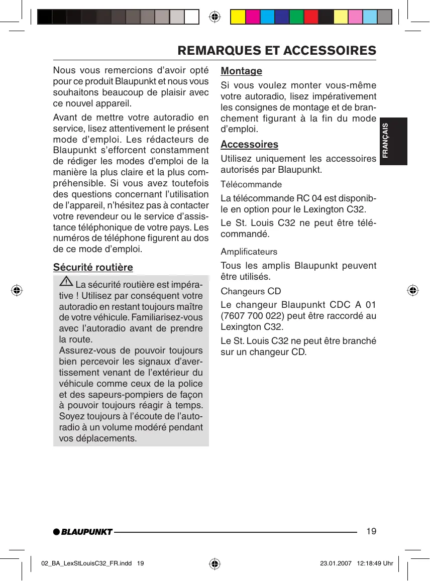 Sécurité routière La sécurité routière est impérative ! Utilisez par conséquent votre autoradio en restant toujours maître de votre véhicule. Familiarisez-vous avec l’autoradio avant de prendre la route. Assurez-vous de pouvoir toujours bien percevoir les signaux d’avertissement venant de l’extérieur du véhicule comme ceux de la police et des sapeurs-pompiers de façon à pouvoir toujours réagir à temps. Soyez toujours à l’écoute de l’autoradio à un volume modéré pendant vos déplacements. Accessoires Utilisez uniquement les accessoires autorisés par Blaupunkt. Télécommande La télécommande RC 04 est disponible en option pour le Lexington C32. Le St. Louis C32 ne peut être télécommandé. Amplificateurs Tous les amplis Blaupunkt peuvent être utilisés. FRANÇAIS Si vous voulez monter vous-même votre autoradio, lisez impérativement les consignes de montage et de branchement figurant à la fin du mode d’emploi. ESPAÑOL Montage PORTUGUÊS Nous vous remercions d’avoir opté pour ce produit Blaupunkt et nous vous souhaitons beaucoup de plaisir avec ce nouvel appareil. Avant de mettre votre autoradio en service, lisez attentivement le présent mode d’emploi. Les rédacteurs de Blaupunkt s’efforcent constamment de rédiger les modes d’emploi de la manière la plus claire et la plus compréhensible. Si vous avez toutefois des questions concernant l’utilisation de l’appareil, n’hésitez pas à contacter votre revendeur ou le service d’assistance téléphonique de votre pays. Les numéros de téléphone figurent au dos de ce mode d’emploi. ENGLISH
