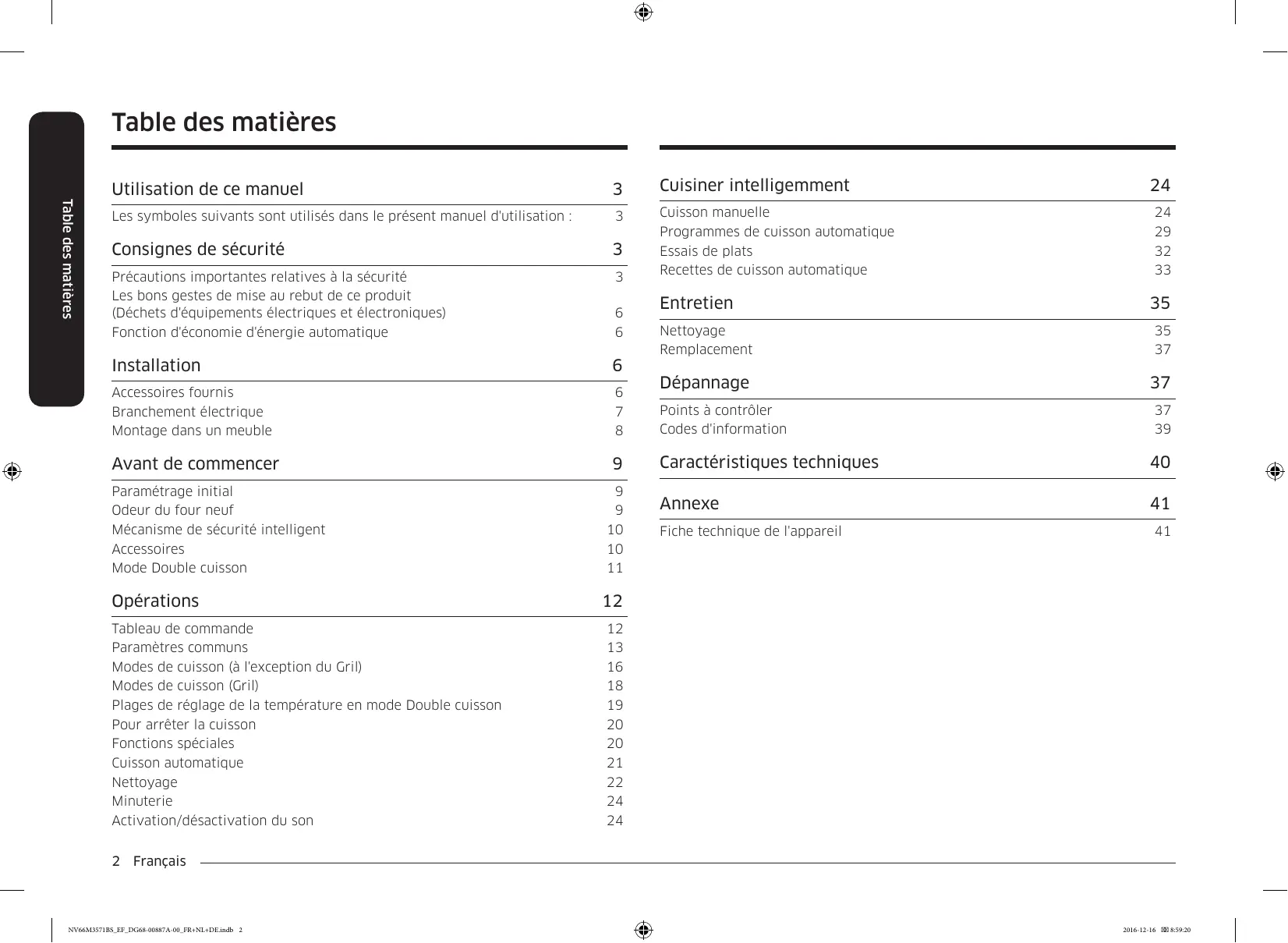 - Lorsque c'est possible, faites cuire plusieurs aliments à la fois. 3 (Unique, Supérieure, Inférieure) électricité 66 L 30 L Encastrable 40,0 kg 32 L Données déterminées conformément à la norme EN 60350-1 et aux Règlements de la Commission Européenne (UE) N°65/2014 et (UE) N°66/2014. Annexe Français NV66M3571BS_EF_DG68-00887A-00_FR+NL+DE.indb 41 2016-12-16
