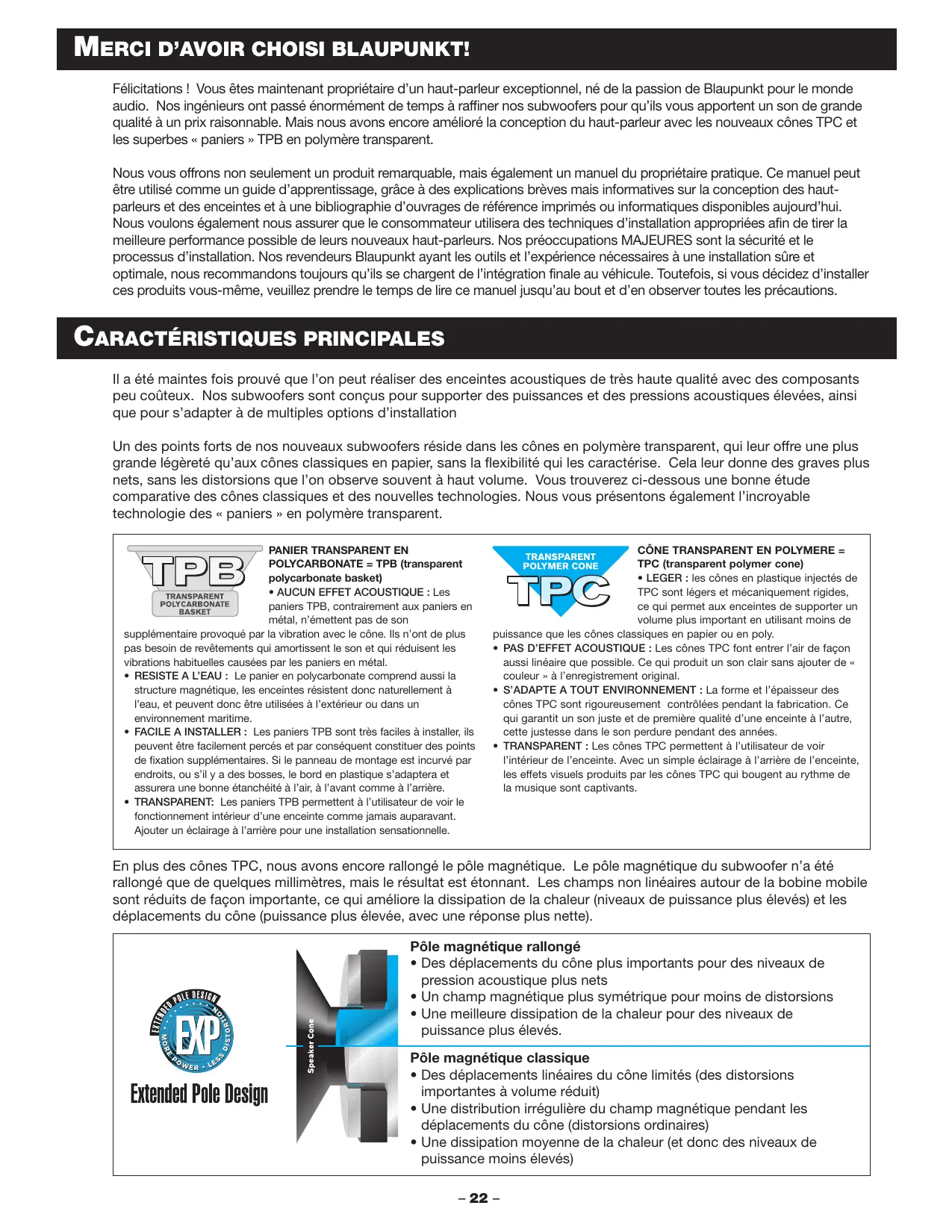 Félicitations! Vous étés maintainant propriétaire d'un haut-parleur exceptionnel, né de la passion de Blaupunkt pour le monde audio. Nos ingénieurs ont passé énormément de temps à raffiner nos subwoofer pour qu'ils vous apportent un son de grande qualité à un prix raisonnable. Mais nous avons encore amélioré la conception du haut-parleur avec les nouveaux cônes TPC et les superbes « paniers » TPB en polymère transparent.