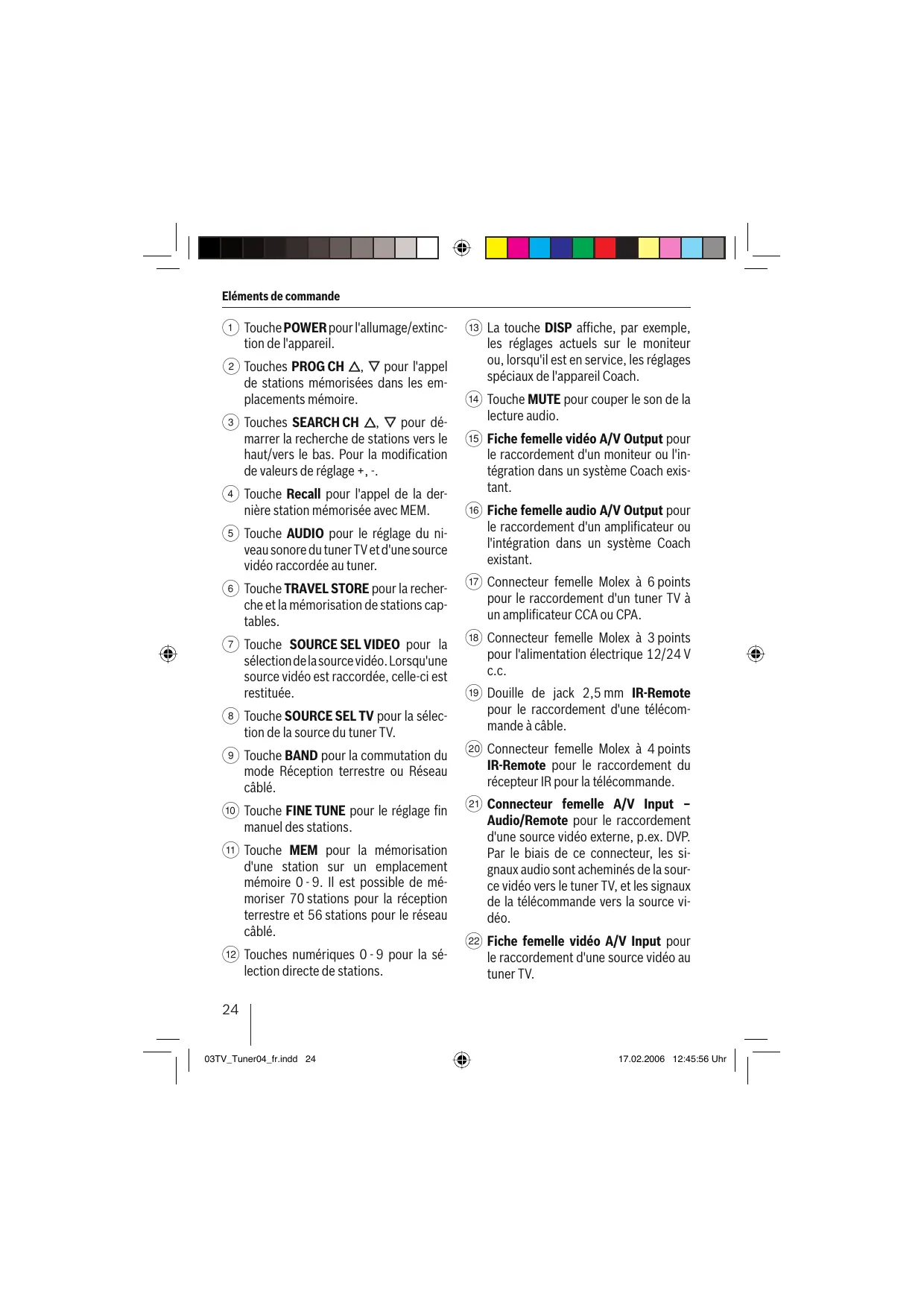⑰ Connecteur femelle Molex à 6 points pour le raccordement d'un tuner TV à un amplificateur CCA ou CPA.