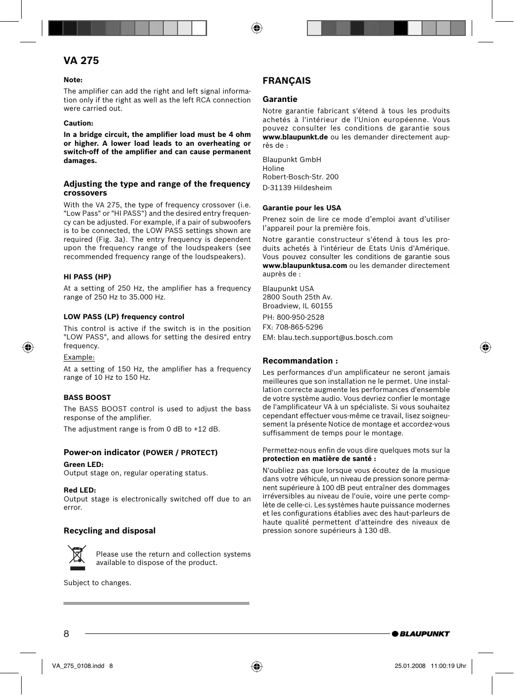 VELOCITY VA 275 - Amplificateur audio BLAUPUNKT - Notice d'utilisation et mode d'emploi gratuit