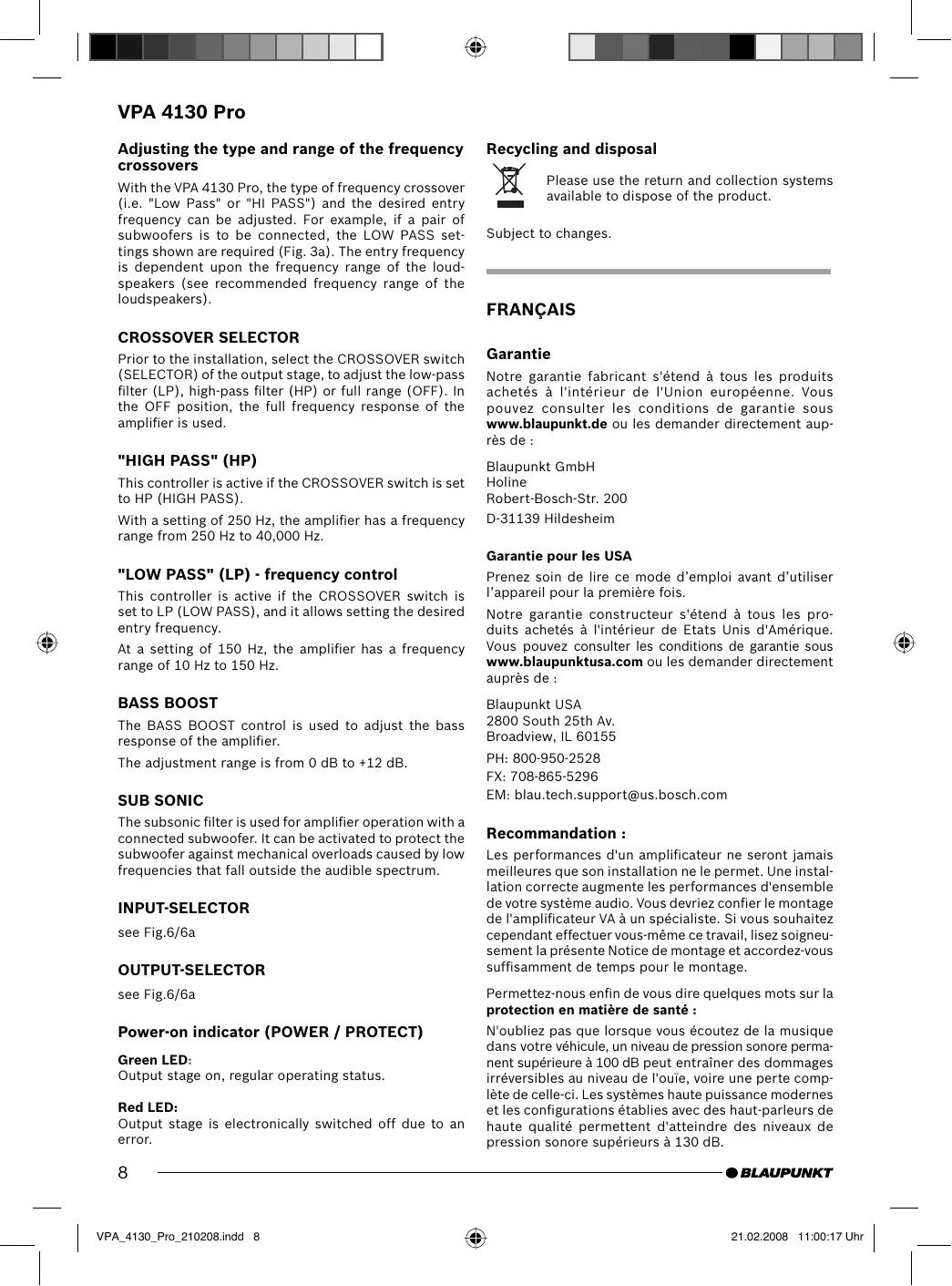Notre garantie constructeur s'étend à tous les produits achetés à l'intérieur de Etats Unis d'Amérique. Vous pouvez consulter les conditions de garantie sous www.blaupunktusa.com ou les demander directement auprès de : Blaupunkt USA 2800 South 25th Av. Broadview, IL 60155 PH: 800-950-2528 FX: 708-865-5296 EM: blau.tech.support@us.bosch.com