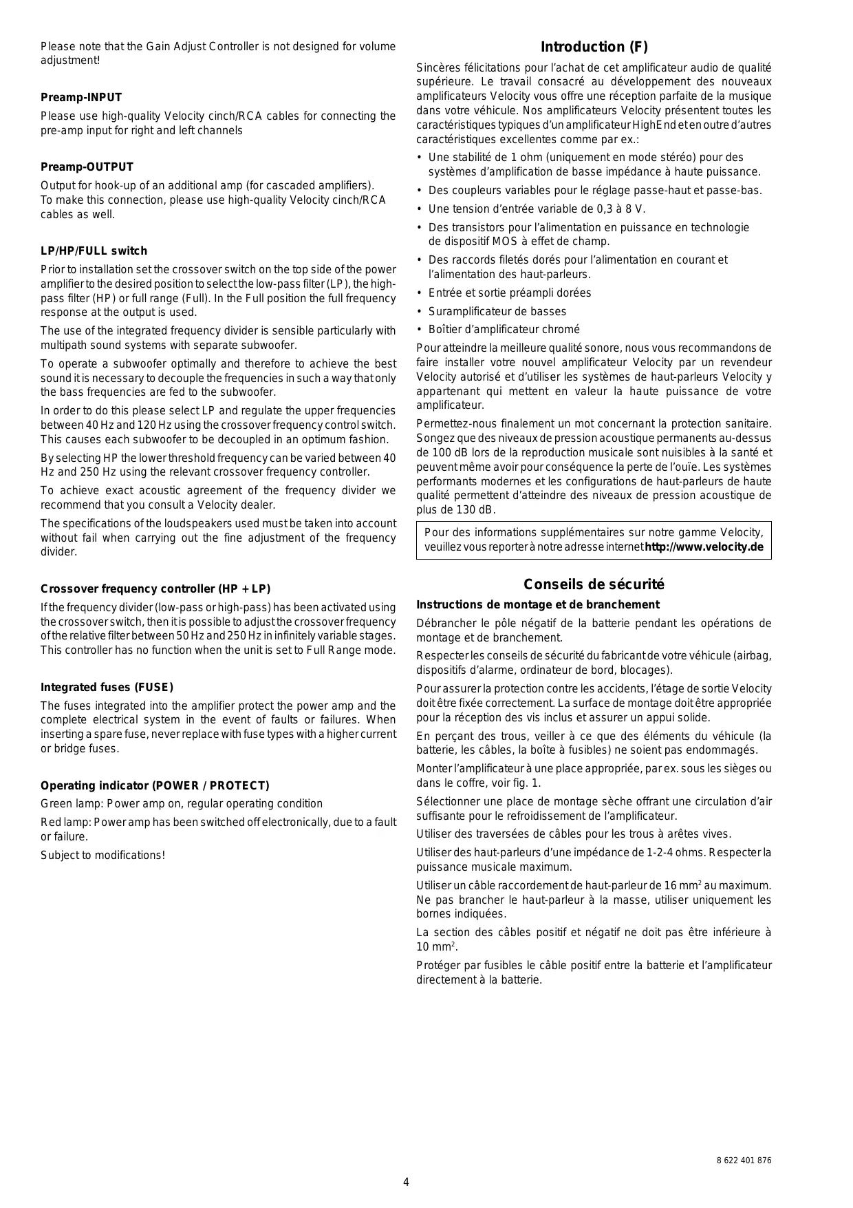 Sincères félicitations pour l’achat de cet amplificateur audio de qualité supérieure. Le travail consacré au développement des nouveaux amplificateurs Velocity vous offre une réception parfaite de la musique dans votre véhicule. Nos amplificateurs Velocity présentent toutes les caractéristiques typiques d’un amplificateur HighEnd et en outre d’autres caractéristiques excellentes comme par ex.: