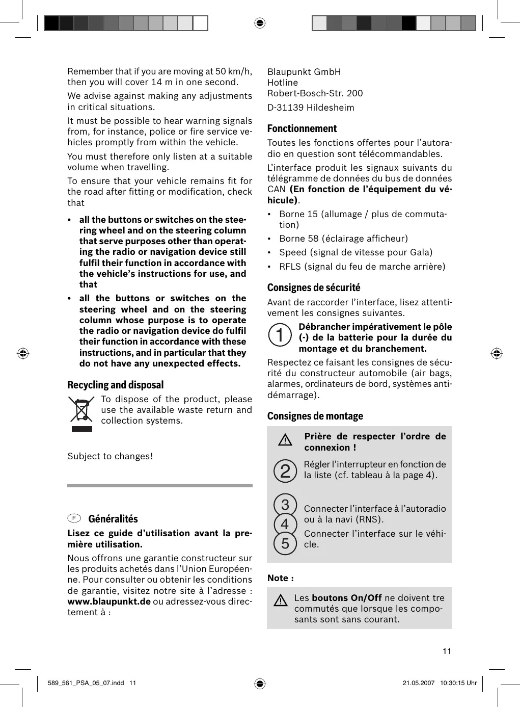 Blaupunkt déclinera toute responsabilité en cas de contrôle insuffisant de la connexion et de l'affection des contacts.