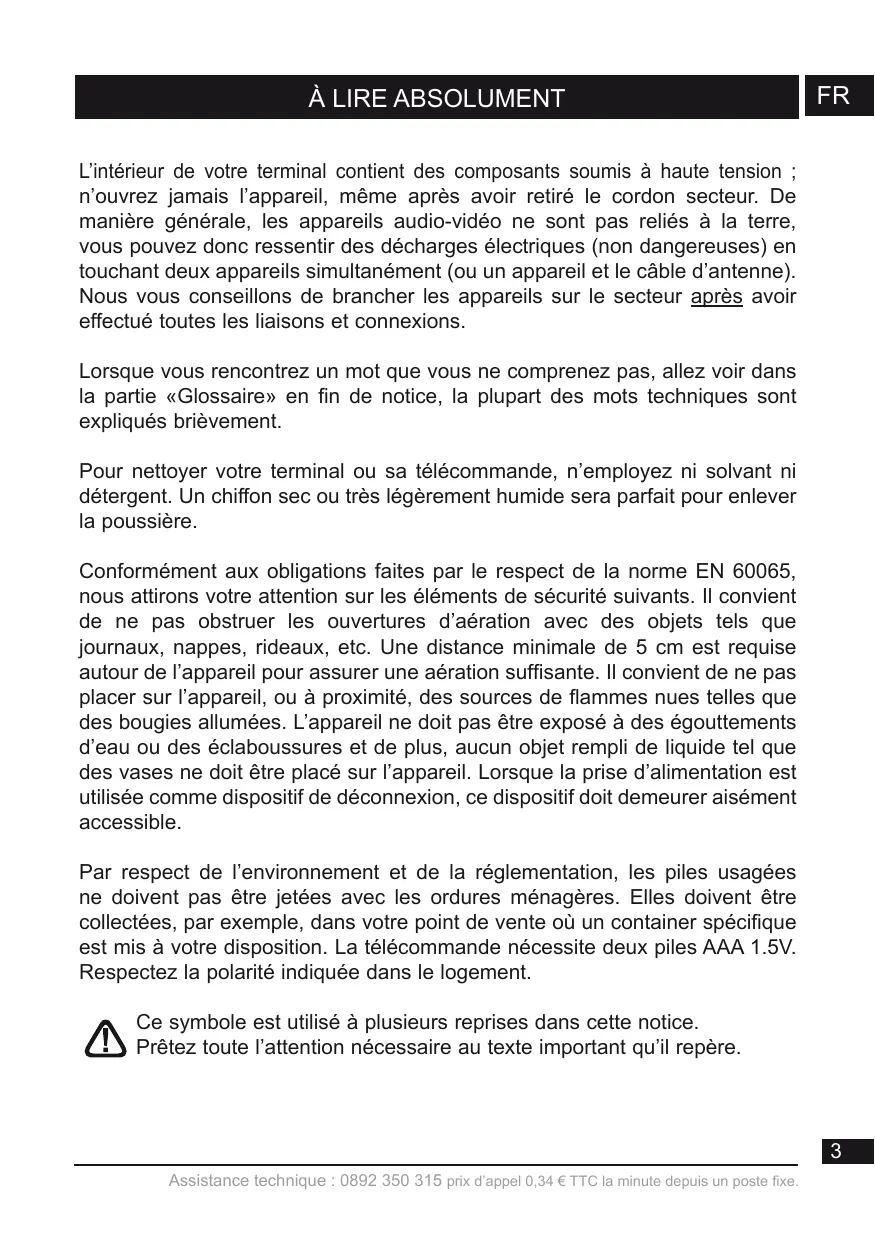 Lorsque vous rencontrez un mot que vous ne comprenez pas, allez voir dans la partie «Glossaire» en fin de notice, la plupart des mots techniques sont expliqués brièvement. Pour nettoyer votre terminal ou sa télécommande, n’employez ni solvant ni détergent. Un chiffon sec ou très légèrement humide sera parfait pour enlever la poussière. Conformément aux obligations faites par le respect de la norme EN 60065, nous attirons votre attention sur les éléments de sécurité suivants. Il convient de ne pas obstruer les ouvertures d’aération avec des objets tels que journaux, nappes, rideaux, etc. Une distance minimale de 5 cm est requise autour de l’appareil pour assurer une aération suffisante. Il convient de ne pas placer sur l’appareil, ou à proximité, des sources de flammes nues telles que des bougies allumées. L’appareil ne doit pas être exposé à des égouttements d’eau ou des éclaboussures et de plus, aucun objet rempli de liquide tel que des vases ne doit être placé sur l’appareil. Lorsque la prise d’alimentation est utilisée comme dispositif de déconnexion, ce dispositif doit demeurer aisément accessible. Par respect de l’environnement et de la réglementation, les piles usagées ne doivent pas être jetées avec les ordures ménagères. Elles doivent être collectées, par exemple, dans votre point de vente où un container spécifique est mis à votre disposition. La télécommande nécessite deux piles AAA 1.5V. Respectez la polarité indiquée dans le logement. Ce symbole est utilisé à plusieurs reprises dans cette notice. Prêtez toute l’attention nécessaire au texte important qu’il repère.