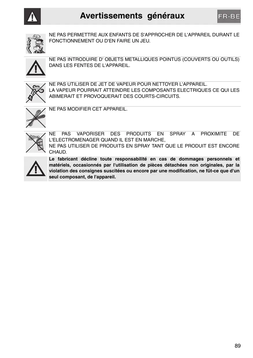 Avertissements généraux NE PAS PERMETTRE AUX ENFANTS DE S'APPROCHER DE L'APPAREIL DURANT LE FONCTIONNEMENT OU D'EN FAIRE UN JEU. NE PAS INTRODUIRE D' OBJETS METALLIQUES POINTUS (COUVERTS OU OUTILS) DANS LES FENTES DE L'APPAREIL. NE PAS UTILISER DE JET DE VAPEUR POUR NETTOYER L'APPAREIL. LA VAPEUR POURRAIT ATTEINDRE LES COMPOSANTS ELECTRIQUES CE QUI LES ABIMERAIT ET PROVOQUERAIT DES COURTS-CIRCUITS. NE PAS MODIFIER CET APPAREIL. NE PAS VAPORISER DES PRODUITS EN SPRAY A PROXIMITE DE L'ELECTROMENAGER QUAND IL EST EN MARCHE, NE PAS UTILISER DE PRODUITS EN SPRAY TANT QUE LE PRODUIT EST ENCORE CHAUD. Le fabricant décline toute responsabilité en cas de dommages personnels et matériels, occasionnés par l'utilisation de pièces détachées non originales, par la violation des consignes suscitées ou encore par une modification, ne fût-ce que d'un seul composant, de l'appareil.