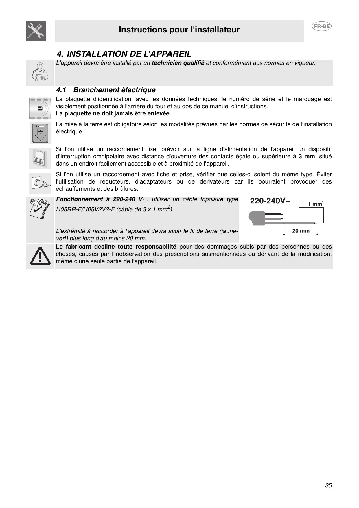 La plaquette d’identification, avec les données techniques, le numéro de série et le marquage est visiblement positionnée à l’arrière du four et au dos de ce manuel d’instructions. La plaquette ne doit jamais être enlevée. La mise à la terre est obligatoire selon les modalités prévues par les normes de sécurité de l’installation électrique. Si l’on utilise un raccordement fixe, prévoir sur la ligne d’alimentation de l'appareil un dispositif d’interruption omnipolaire avec distance d'ouverture des contacts égale ou supérieure à 3 mm, situé dans un endroit facilement accessible et à proximité de l’appareil. Si l’on utilise un raccordement avec fiche et prise, vérifier que celles-ci soient du même type. Éviter l’utilisation de réducteurs, d’adaptateurs ou de dérivateurs car ils pourraient provoquer des échauffements et des brûlures. Fonctionnement à 220-240 V˜ : utiliser un câble tripolaire type H05RR-F/H05V2V2-F (câble de 3 x 1 mm2). L'extrémité à raccorder à l'appareil devra avoir le fil de terre (jaunevert) plus long d’au moins 20 mm. Le fabricant décline toute responsabilité pour des dommages subis par des personnes ou des choses, causés par l'inobservation des prescriptions susmentionnées ou dérivant de la modification, même d'une seule partie de l'appareil.