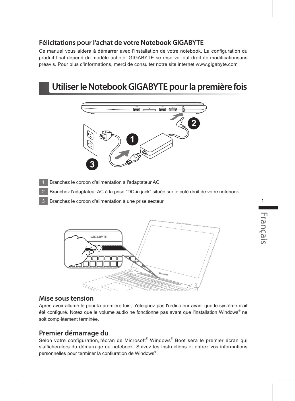 Félicitations pour l'achat de votre Notebook GIGABYTE Ce manuel vous aidera à démarrer avec l'installation de votre notebook. La configuration du produit final dépend du modèle acheté. GIGABYTE se réserve tout droit de modificationsans préavis. Pour plus d'informations, merci de consulter notre site internet www.gigabyte.com