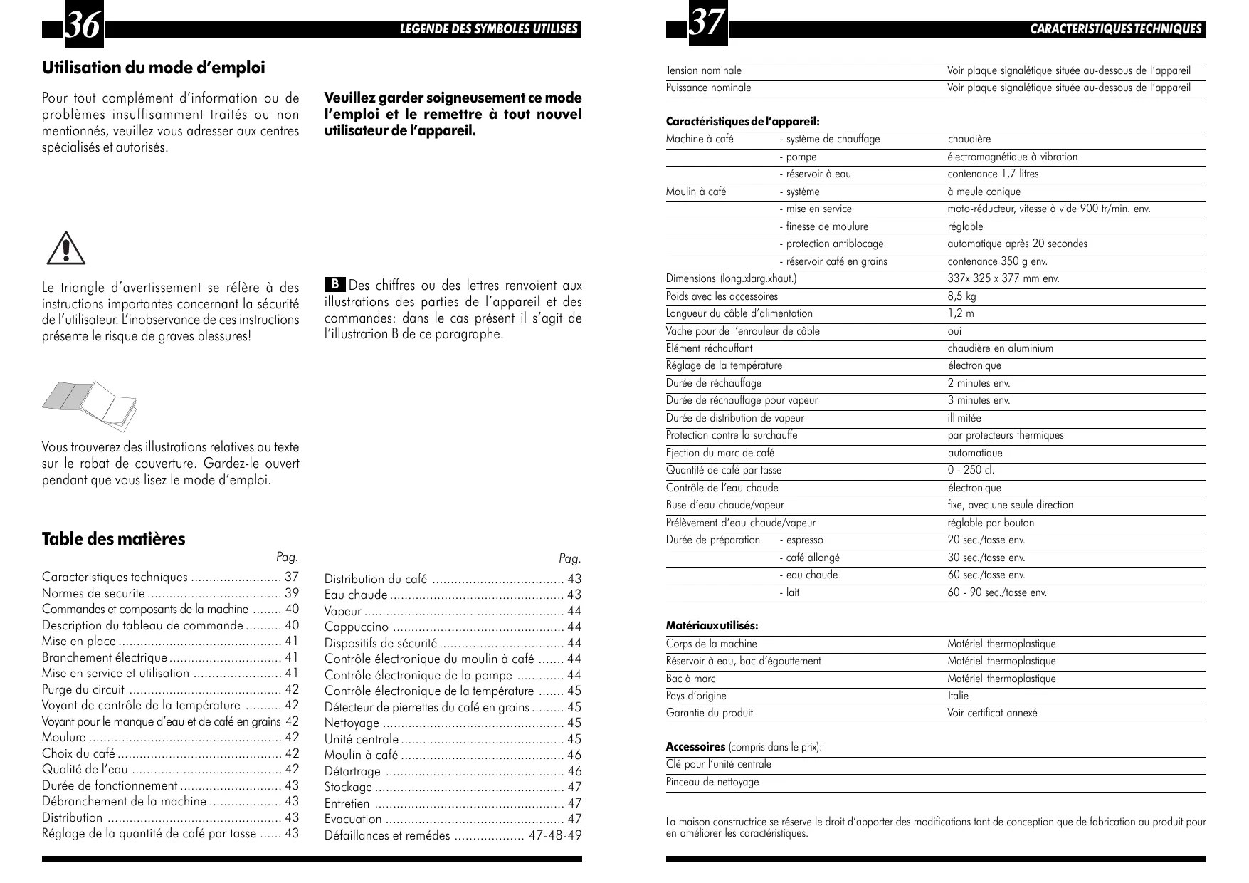 Normes de securite 39 Commandes et composants de la machine 40 Description du tableau de commande 40 Mise en place 41 Branchement électrique 41 Mise en service et utilisation 41 Purge du circuit 42 Voyant de contrôle de la température 42 Voyant pour le manque deau et de café en grains 42 Moulure 42 Choix du café 42 Qualité de leau 42 Durée de fonctionnement 43 Débranchement de la machine 43 Distribution 43 Réglage de la quantité de café par tasse 43