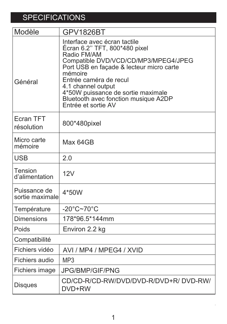 | Général | Interface avec écran tactile Écran 6.2" TFT, 800*480 pixel Radio FM/AM Compatible DVD/VCD/CD/MP3/MPEG4/JPEG Port USB en façade & lecteur micro carte mémoire Entréeamera de recul 4.1 channel output 4*50W puissance de sortie maximale Bluetooth avec fonction musique A2DP Entrée et sortie AV |