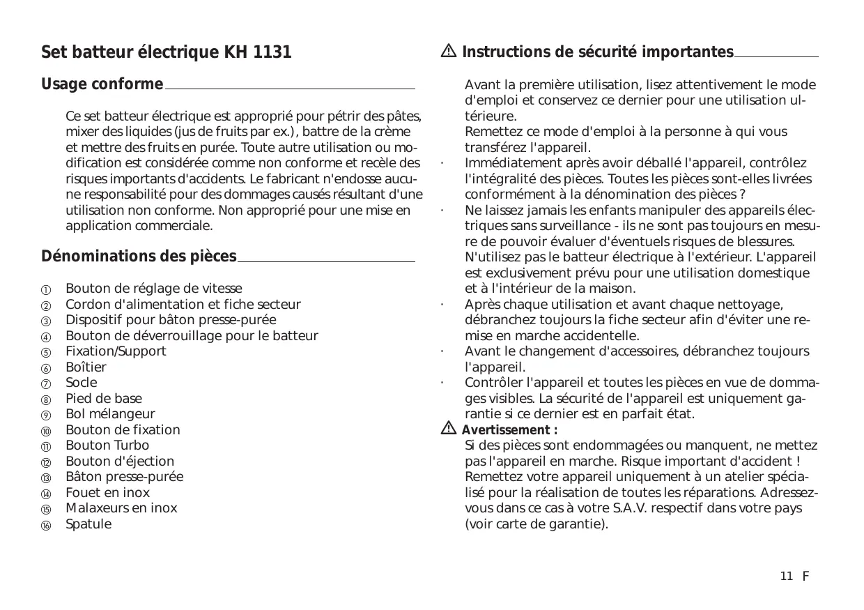 Set batteur électrique KH 1131 Instructions de sécurité importantes Usage conforme Ce set batteur électrique est approprié pour pétrir des pâtes, mixer des liquides (jus de fruits par ex.), battre de la crème et mettre des fruits en purée. Toute autre utilisation ou modification est considérée comme non conforme et recèle des risques importants d'accidents. Le fabricant n'endosse aucune responsabilité pour des dommages causés résultant d'une utilisation non conforme. Non approprié pour une mise en application commerciale.